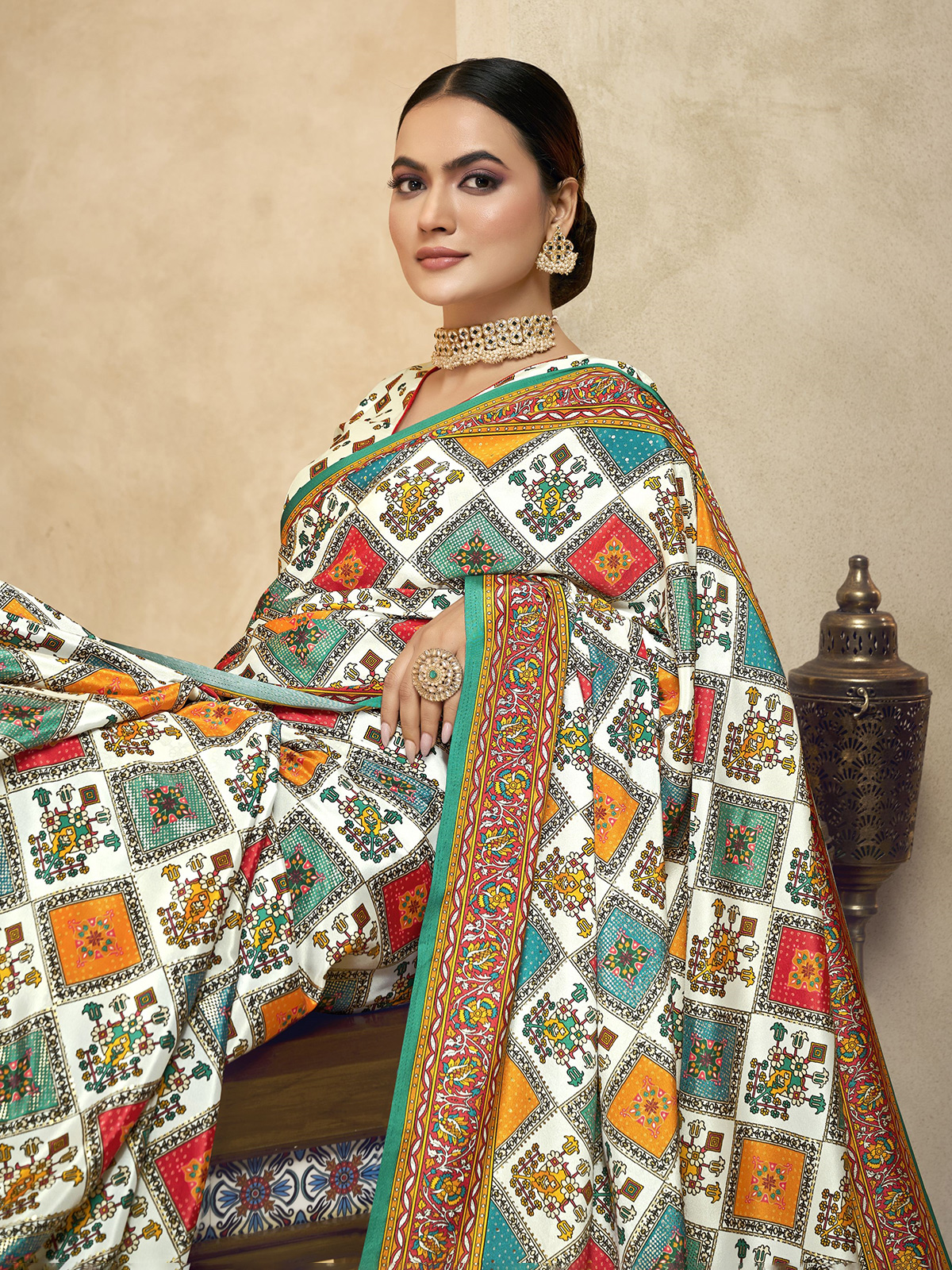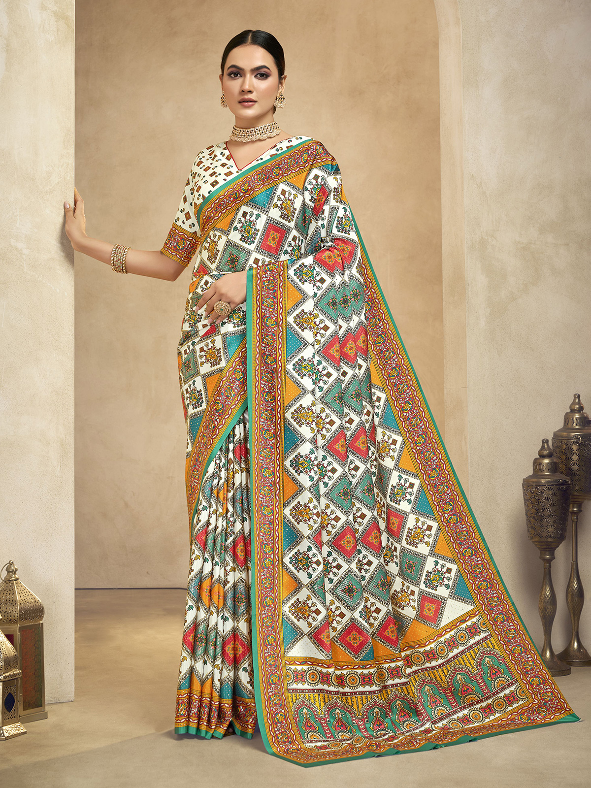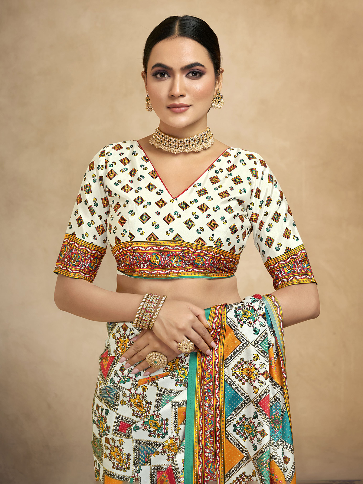 Clean and elegant, this white crepe silk saree features minimal digital prints for a modern ethnic appeal. Its fluid drape is complemented by an unstitched blouse piece, making it an effortless choice for festive occasions, casual gatherings and understated everyday elegance.