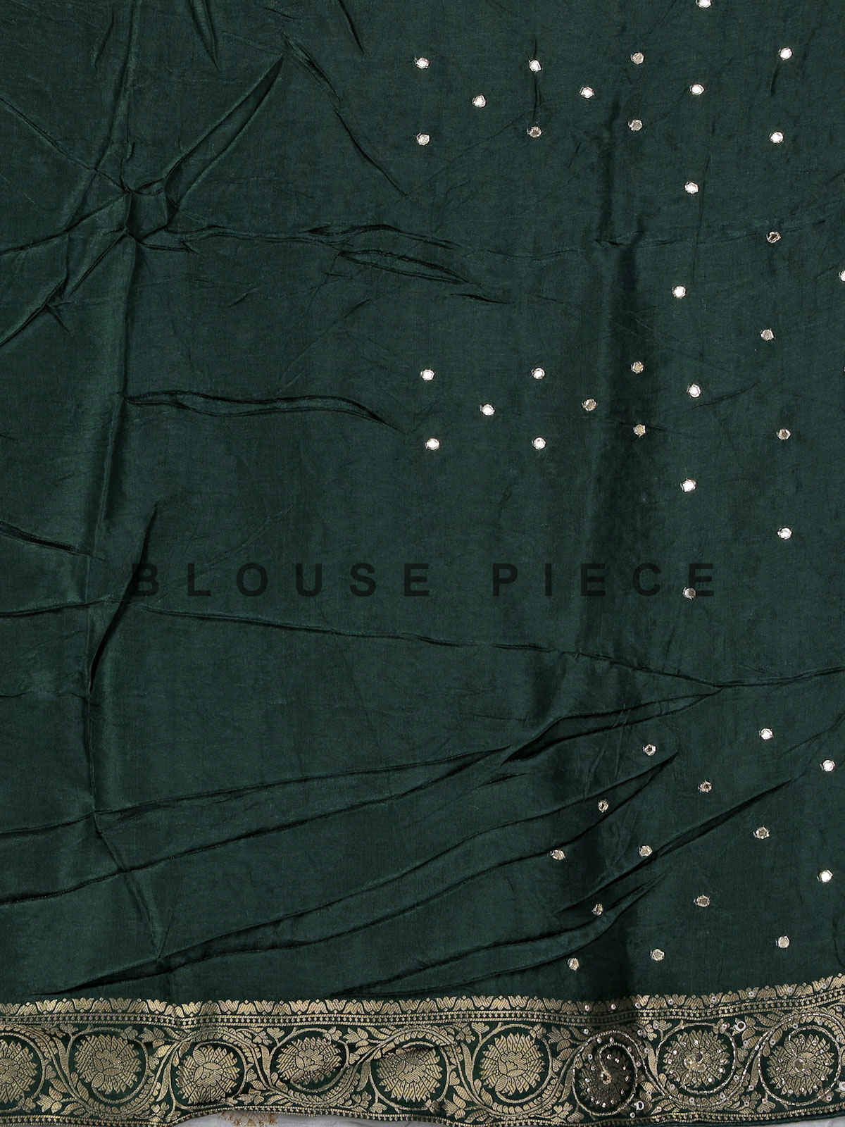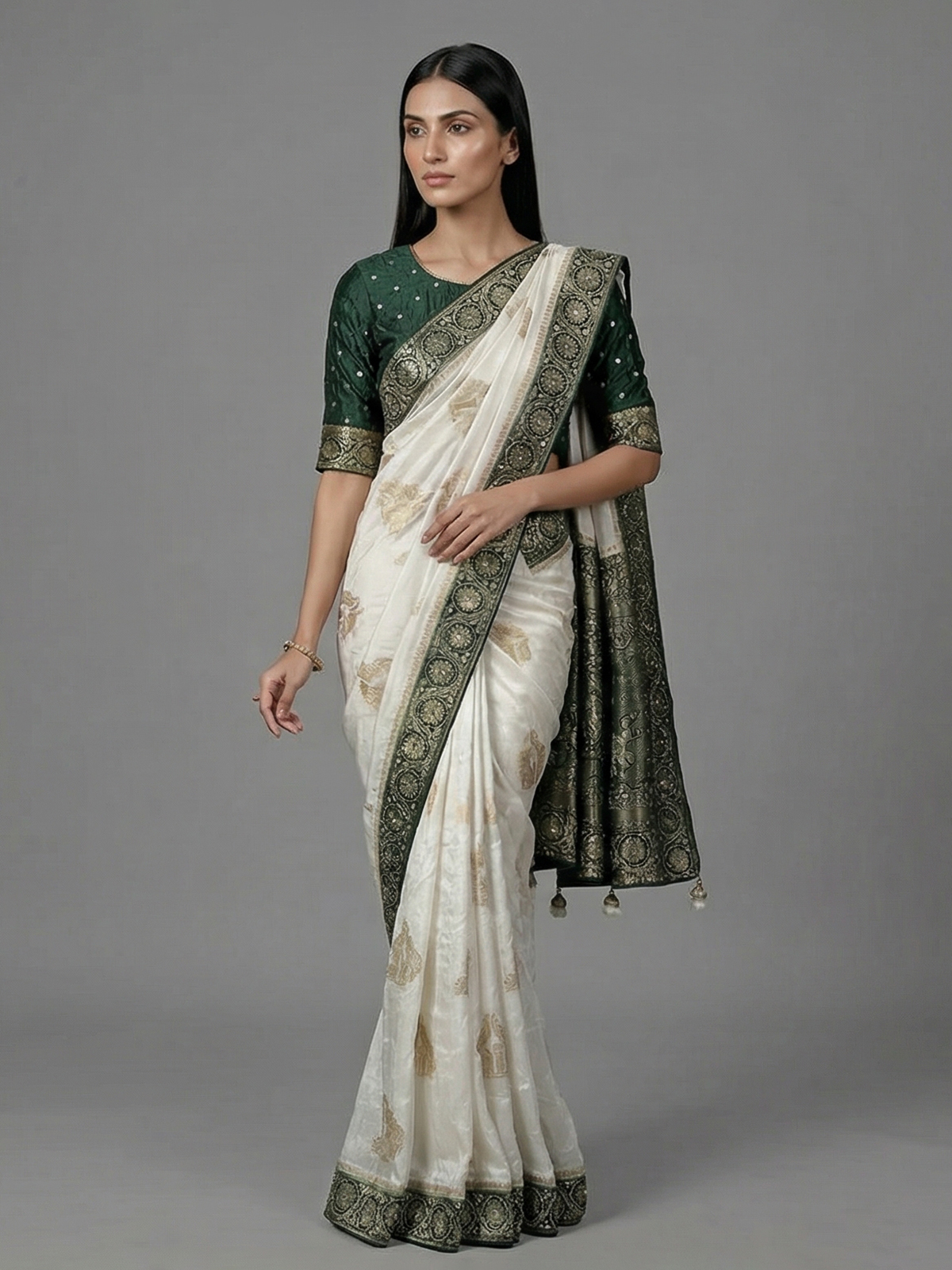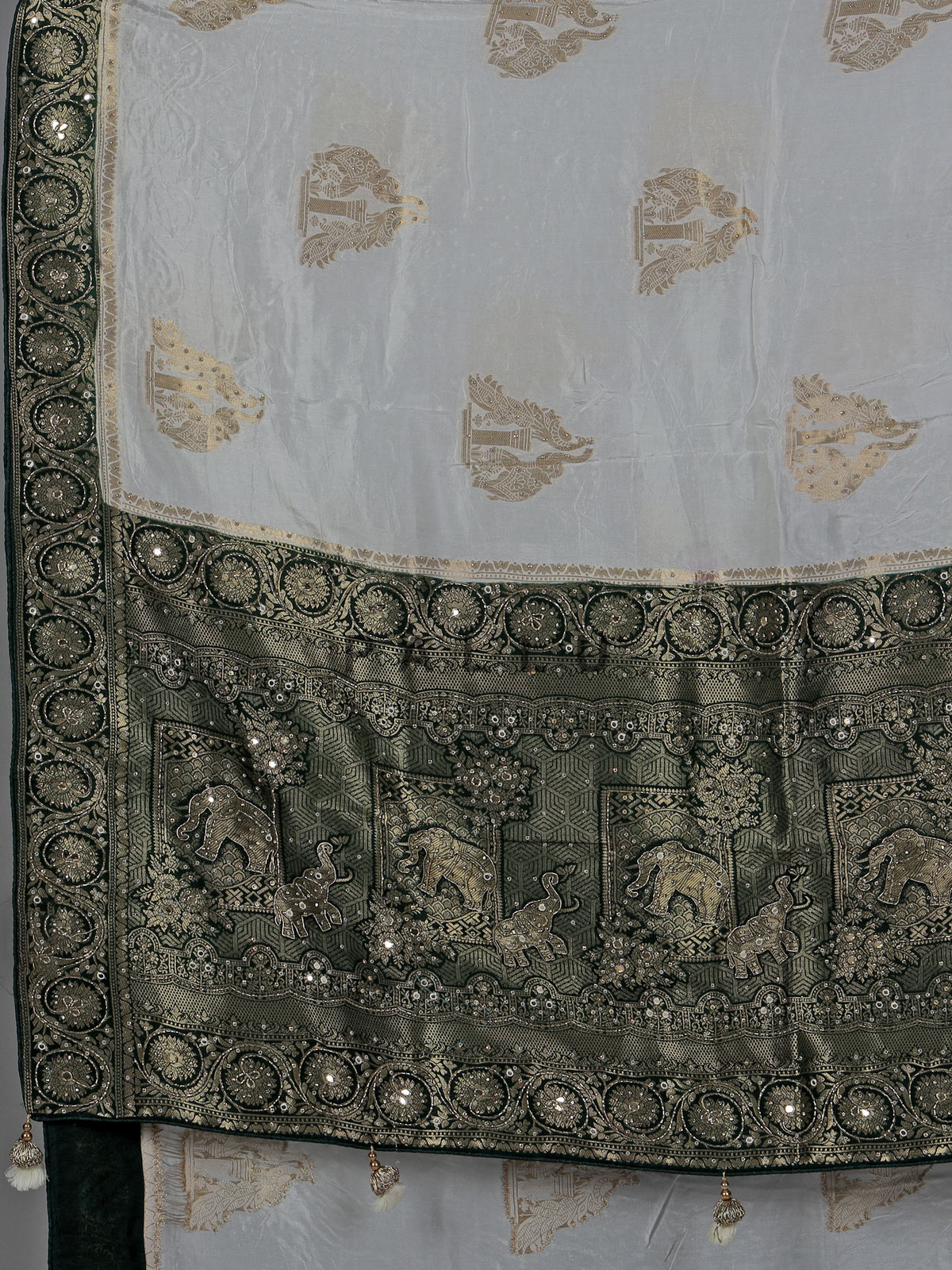 Pure white sophistication defines this dola silk saree, enhanced with detailed cutdana, sequins, thread, mirror, stone and zari work. The contrast border and pallu create a striking festive appeal. Perfect for weddings and celebrations, it comes with an unstitched blouse piece.