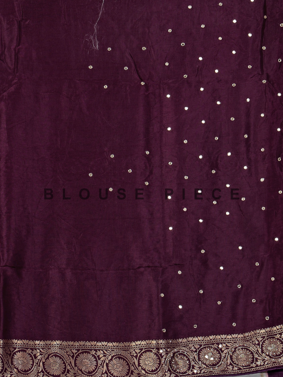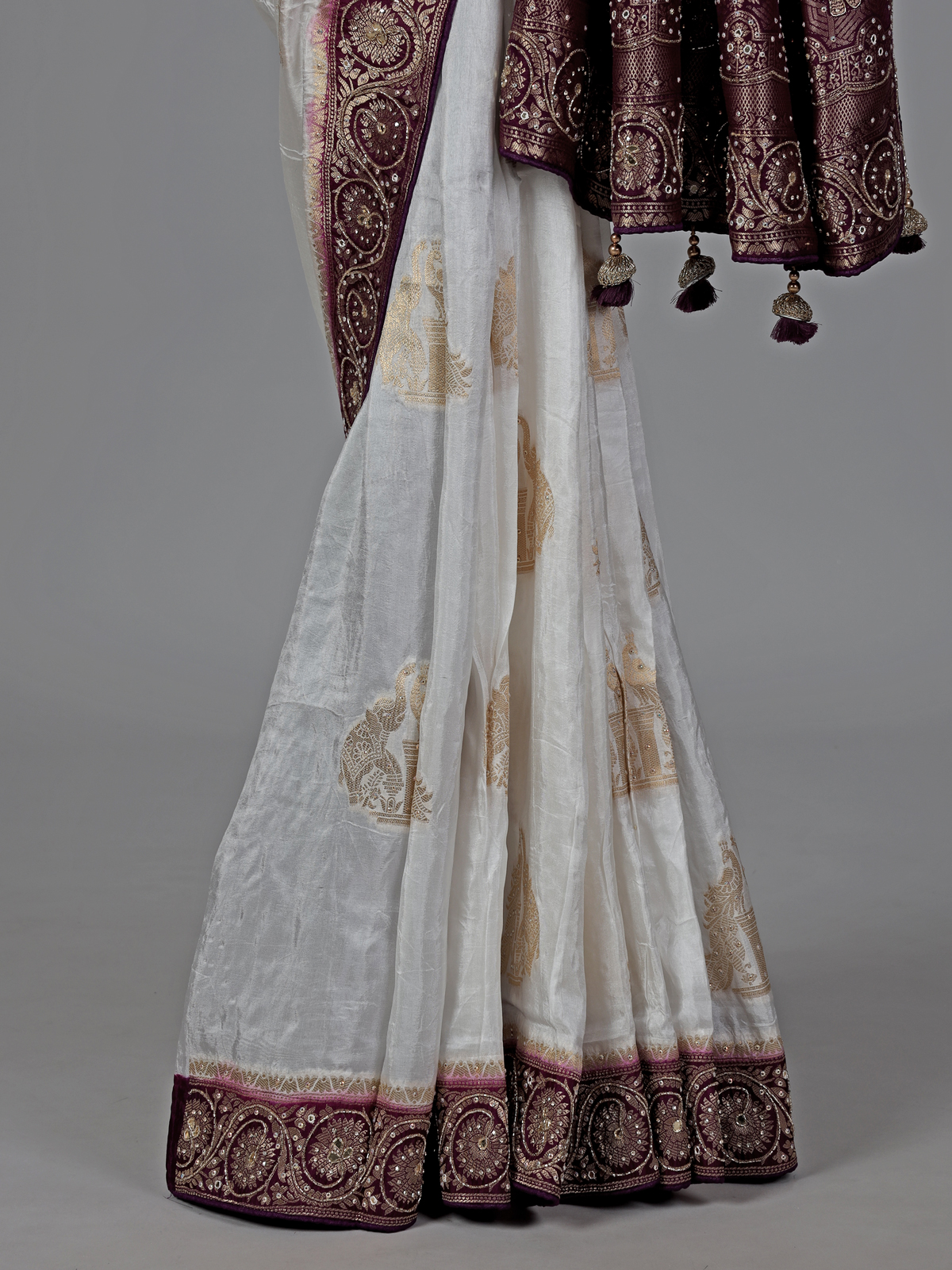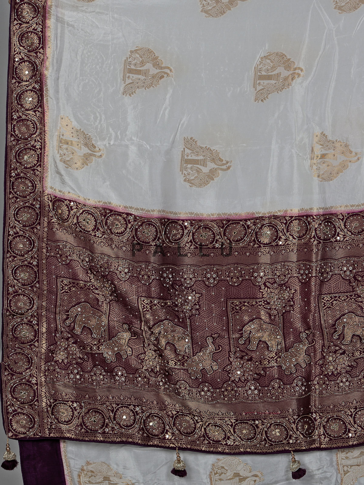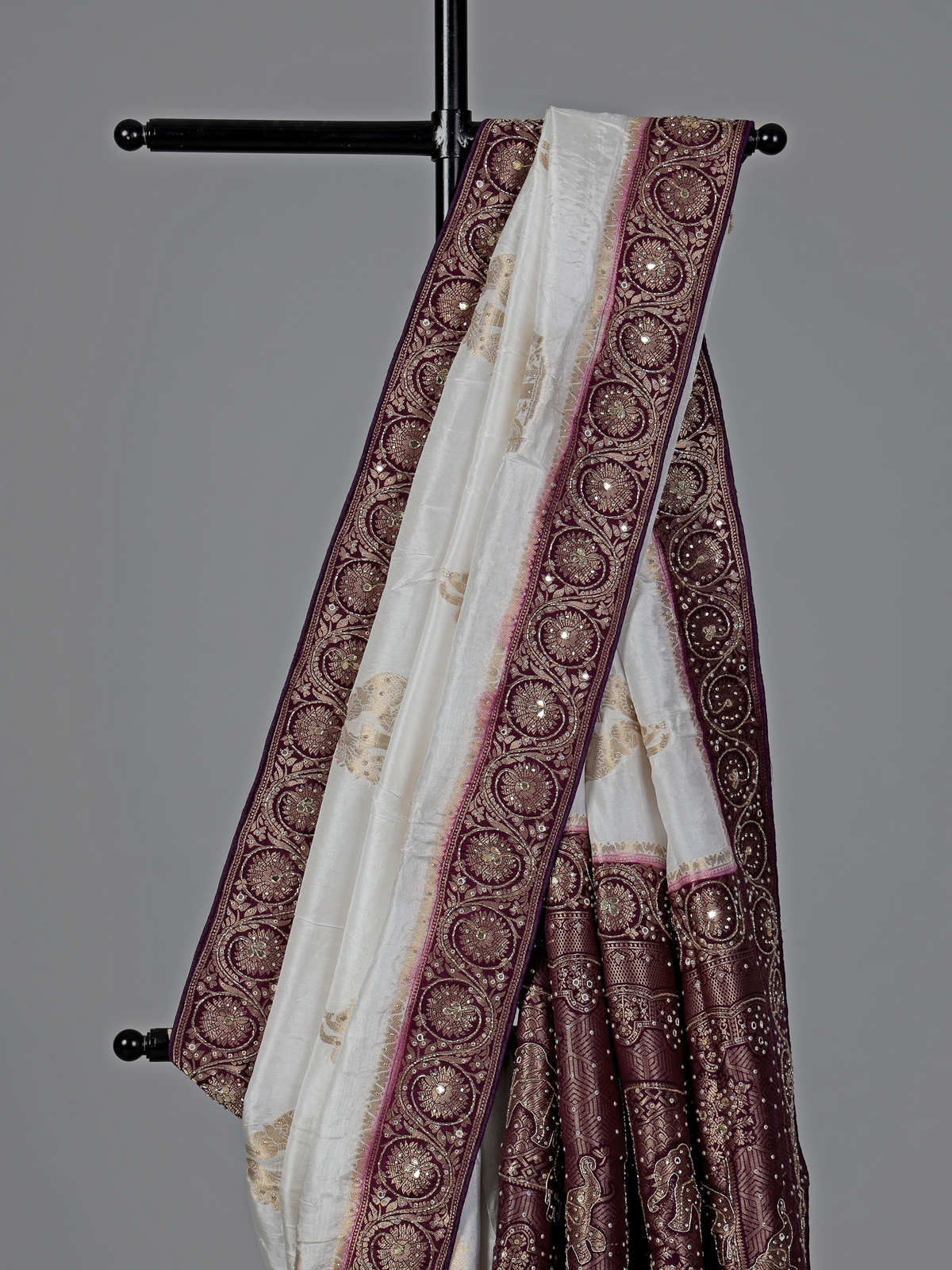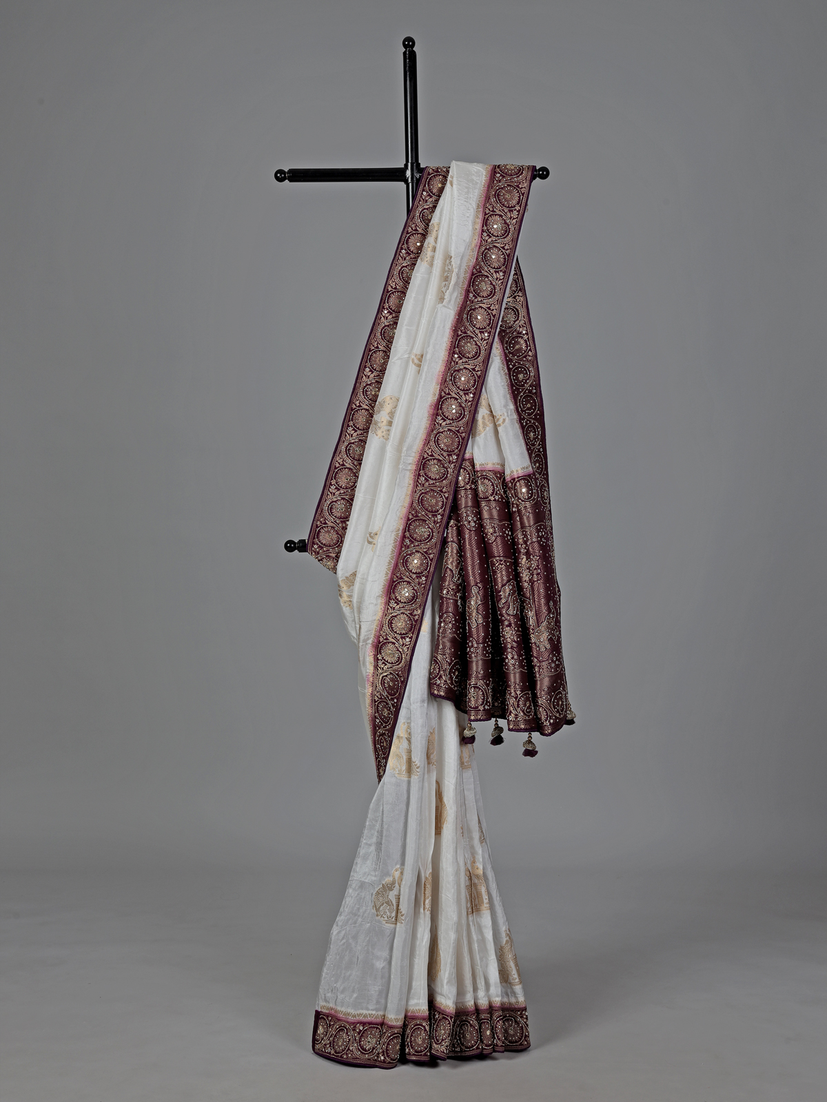 Grace meets opulence in this white dola silk saree, featuring detailed cutdana, sequins, thread, mirror, stone and zari work. The wine contrast border and pallu add regal depth, making it perfect for festive occasions. Comes with an unstitched blouse piece for personalized elegance.