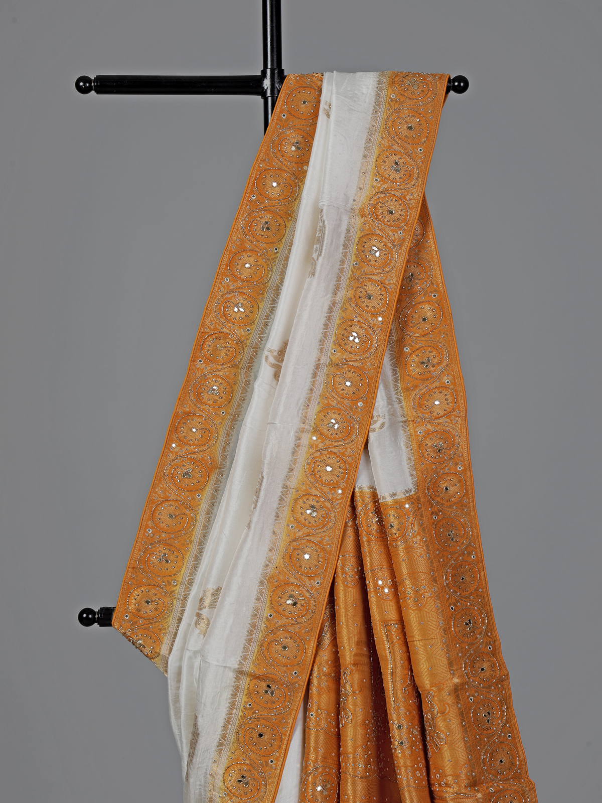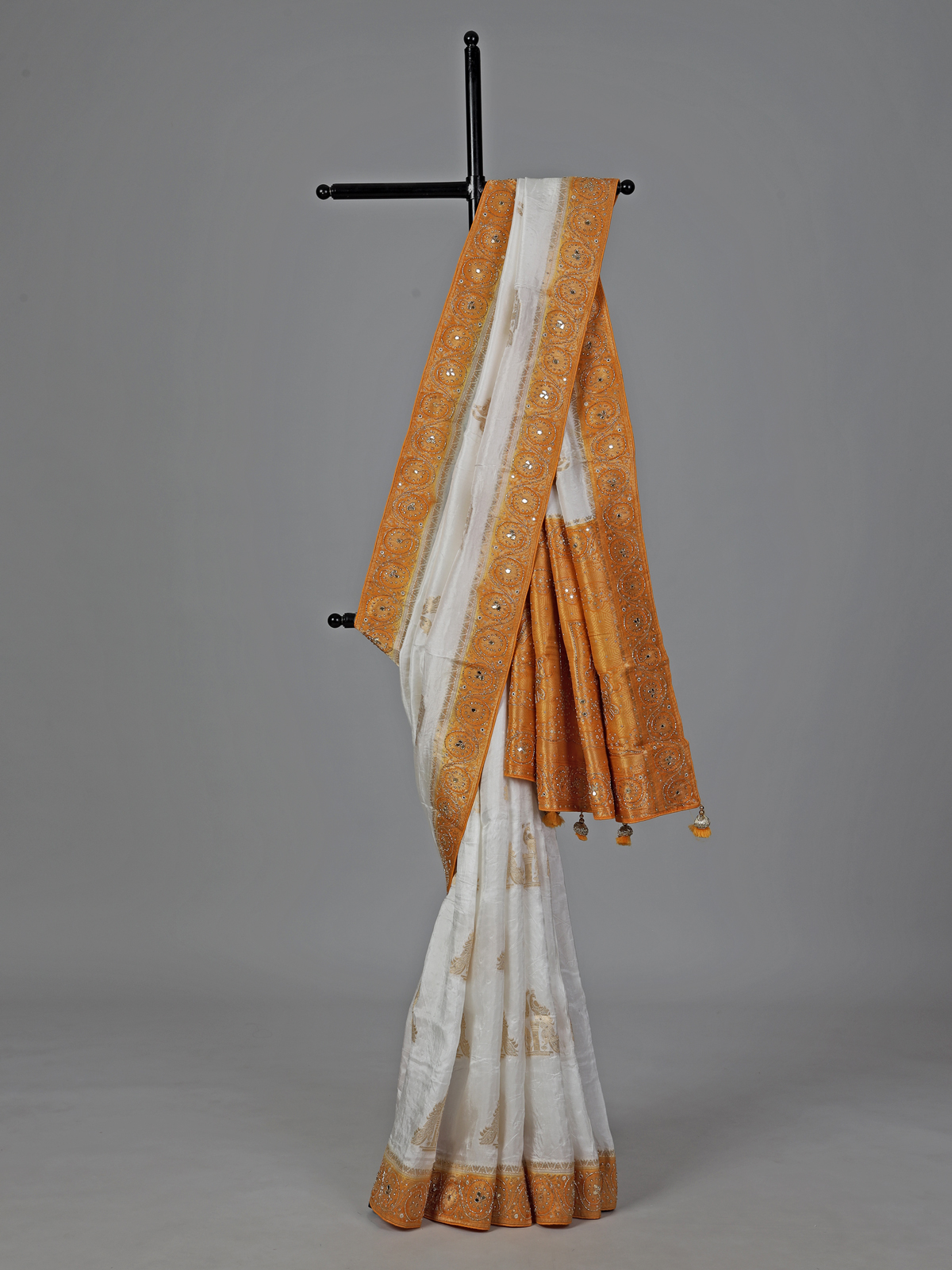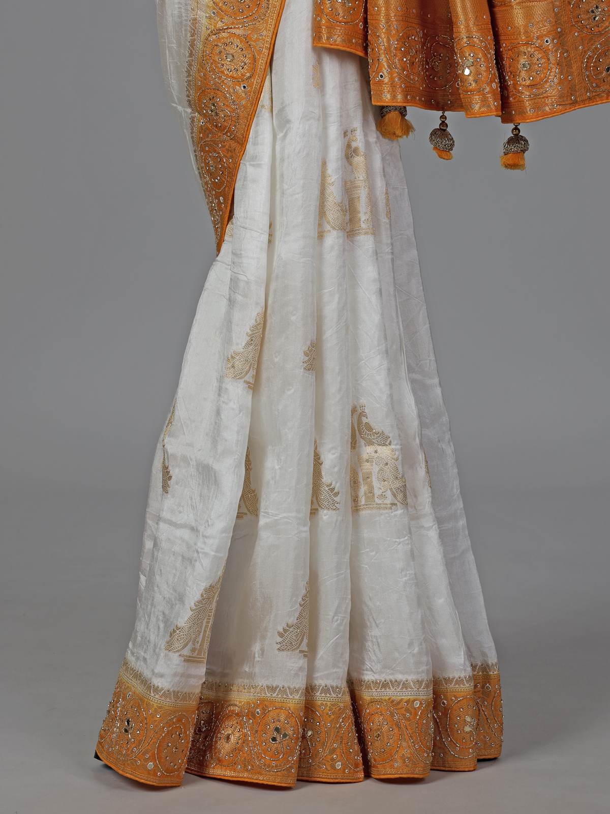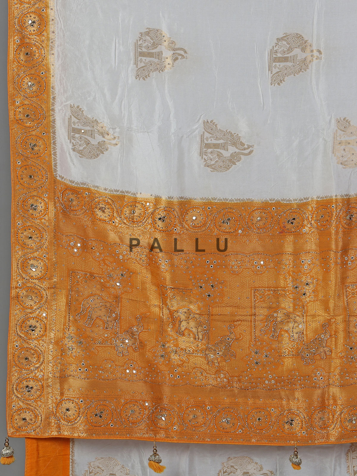 Bright and festive, this white dola silk saree is adorned with intricate cutdana, sequins, thread, mirror, stone and zari embellishments. The yellow contrast border and pallu add a cheerful vibrant touch. Ideal for weddings and celebrations, it includes an unstitched blouse piece for elegant styling.