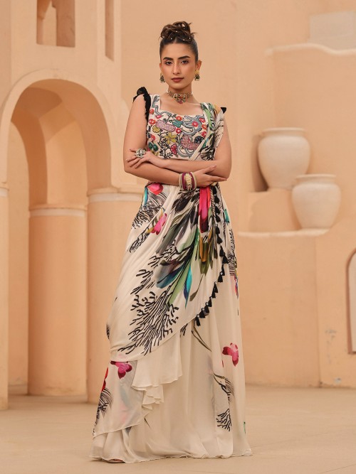 White Floral Printed Pre-drape Saree