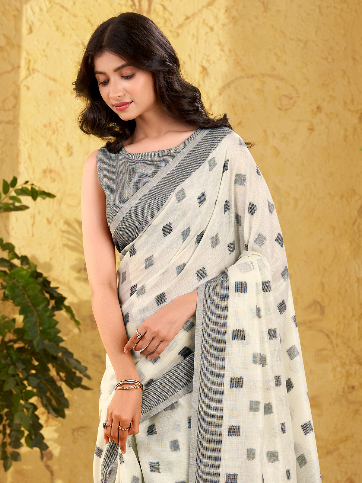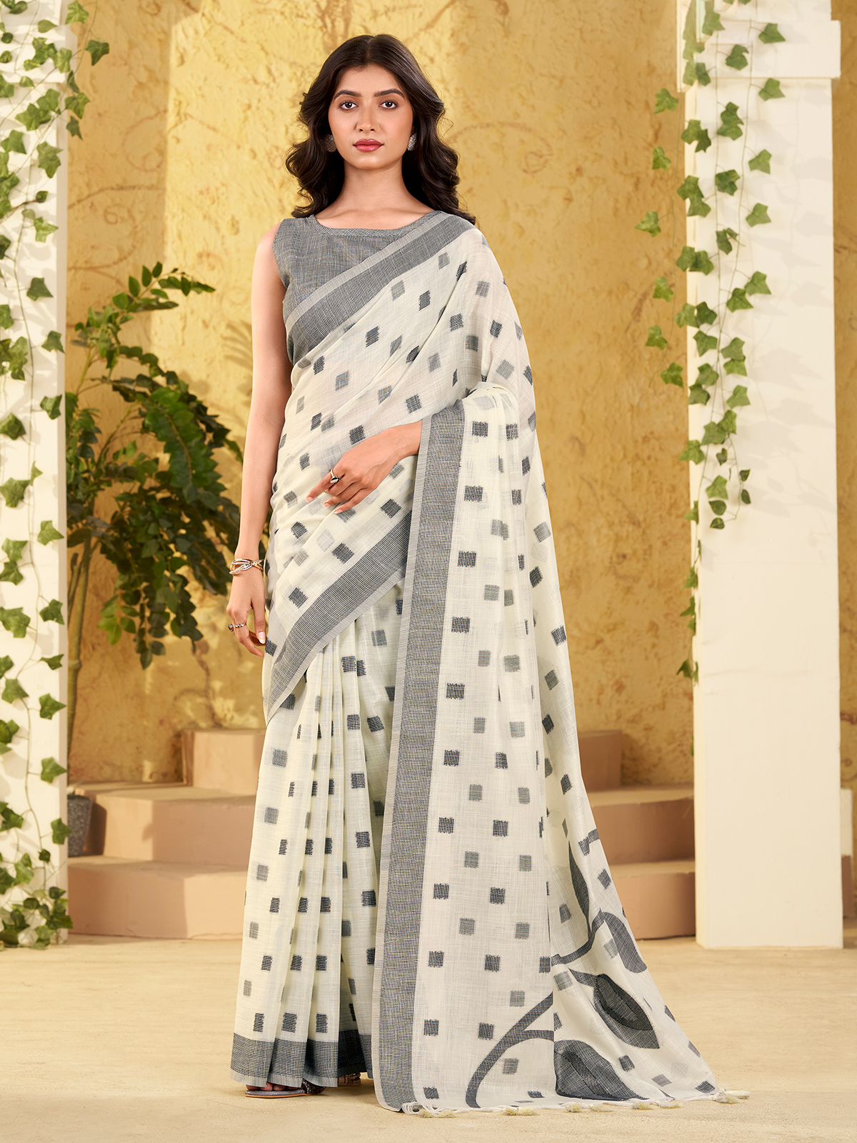 White Linen Silk Woven Work Saree