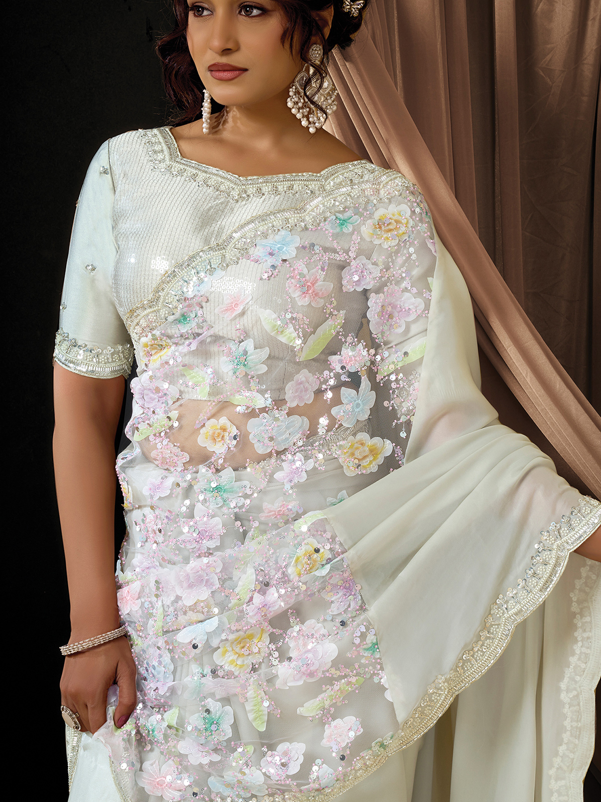 Highlighting the pristine beauty of women, this white satin silk saree exudes timeless sophistication and refined luxury. Designed with sequins, cutdana, and intricate applique work, it offers a striking blend of shimmer and detailed artistry. Suitable for festivals, receptions, and weddings, it comes with an unstitched blouse featuring heavy work.