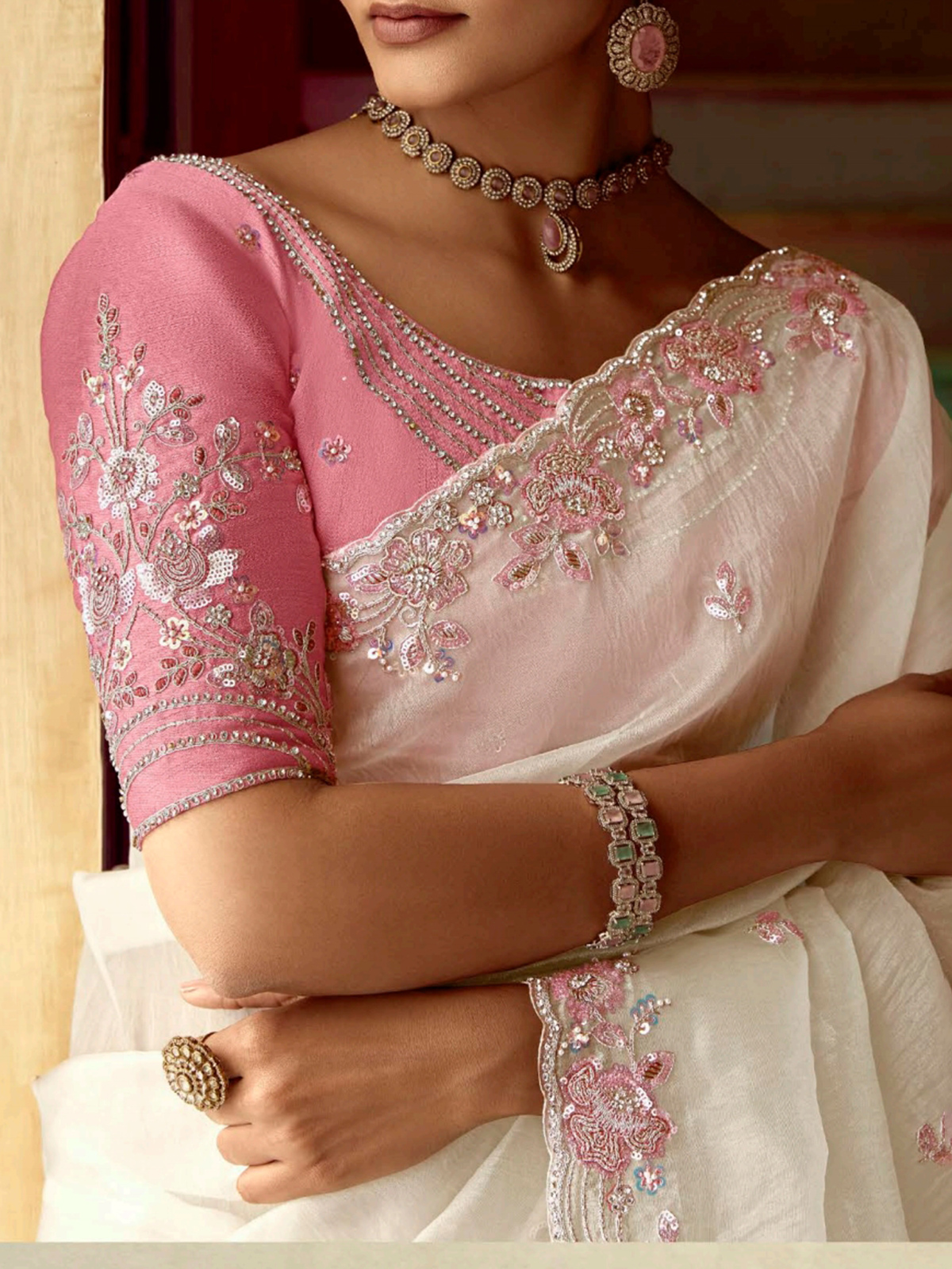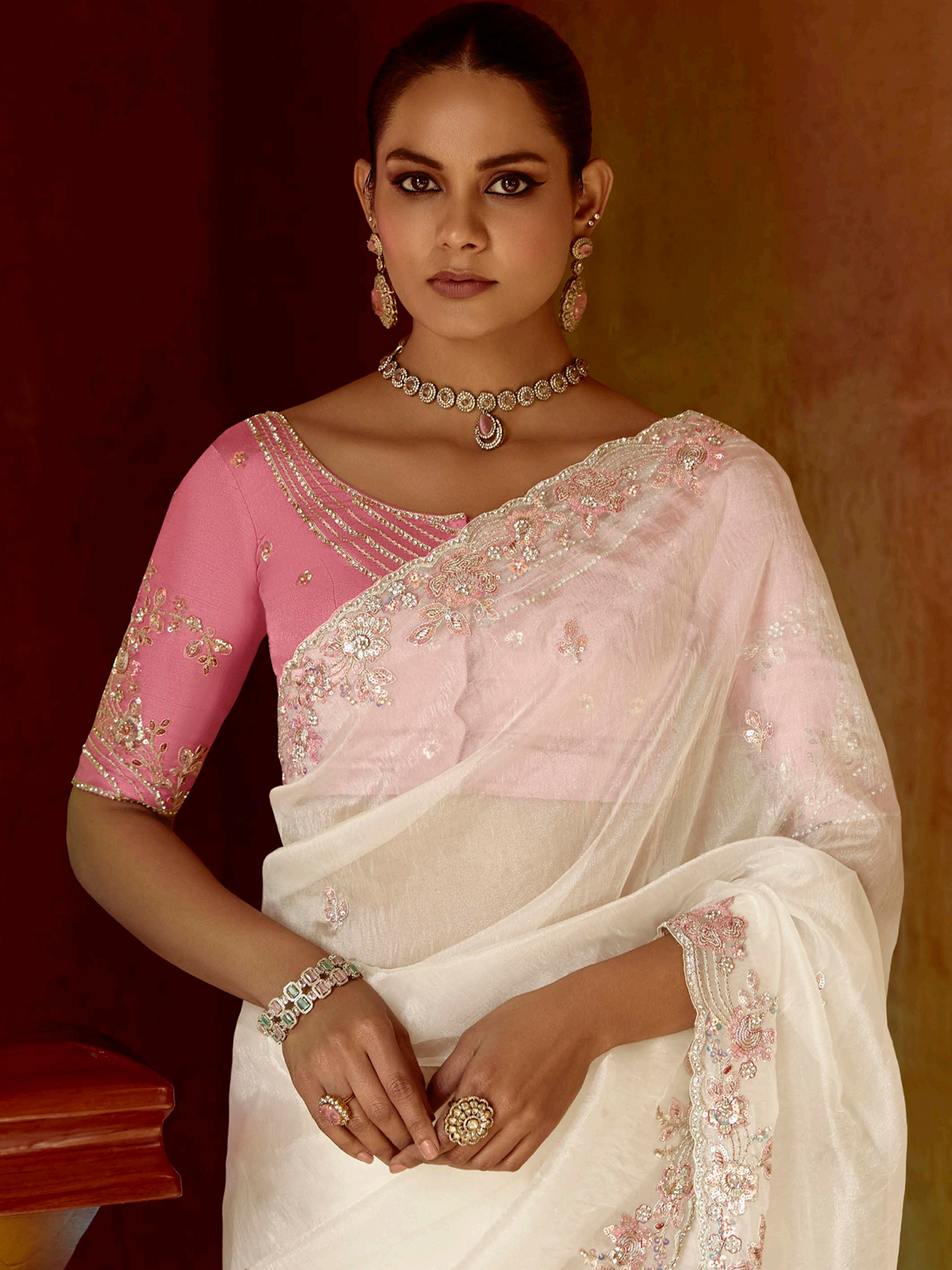A vision of elegance, this tissue silk saree sparkles with sequins, beads, resham, and stone work. Lightweight yet ornate, it adds sophistication to festive or wedding celebrations. It comes with an unstitched blouse piece, making it the perfect canvas for designing a personalized ethnic ensemble full of charm.
