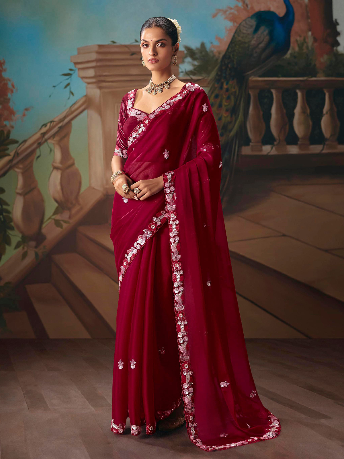 This rich wine fancy tissue silk saree is elevated with elegant embroidery and subtle sequin detailing. Flowing gracefully with a refined sheen, it includes an unstitched blouse piece and is a beautiful choice for weddings, festive evenings and celebratory sangeet occasions.