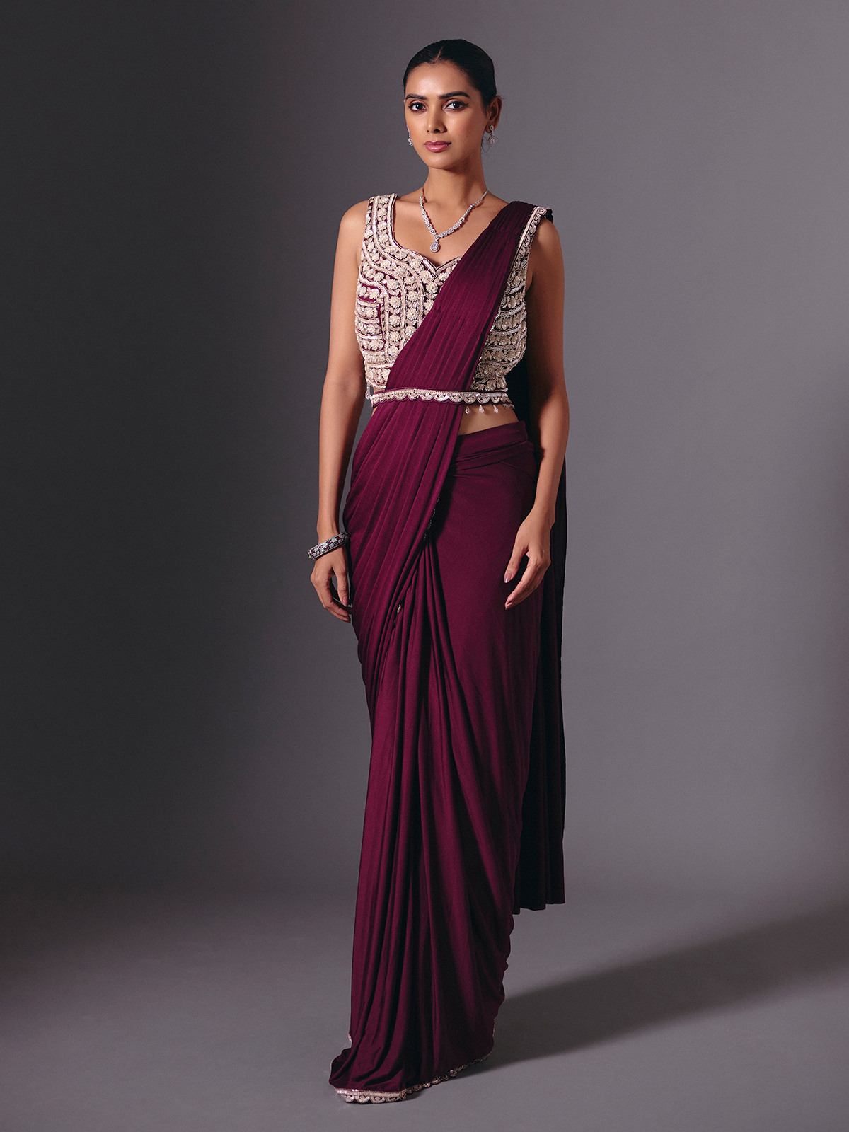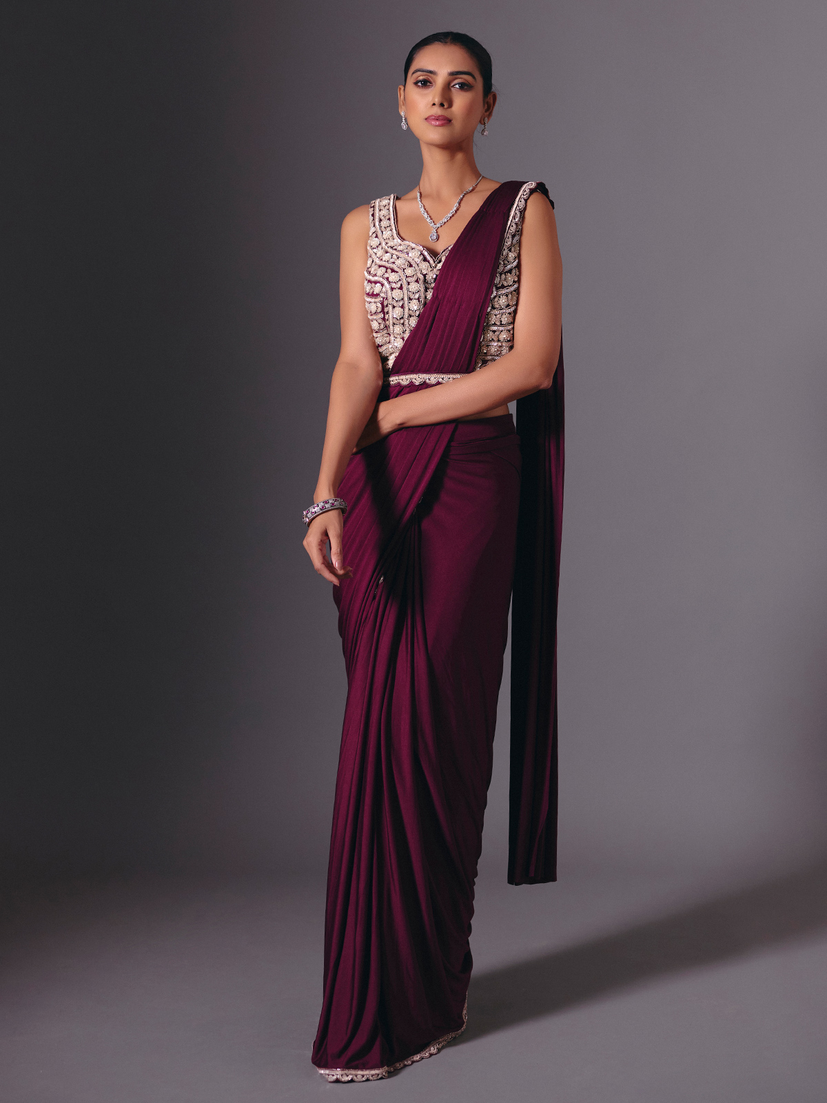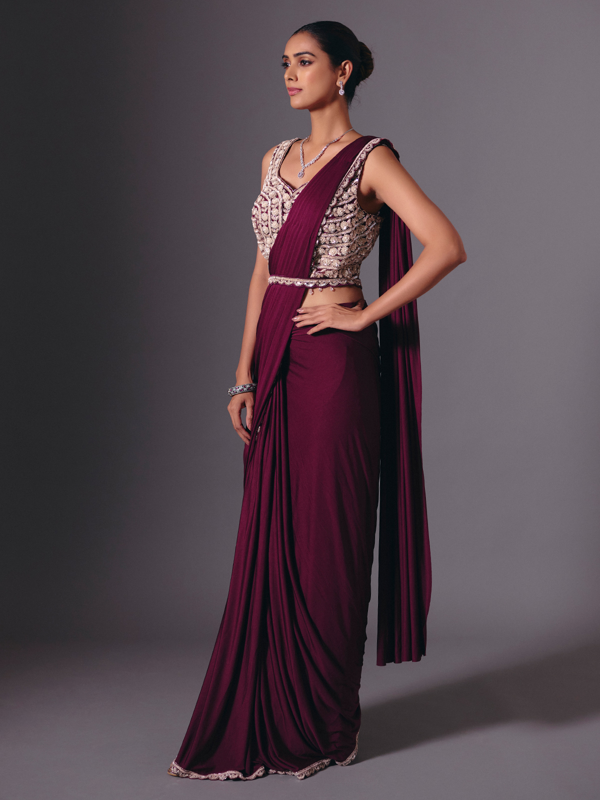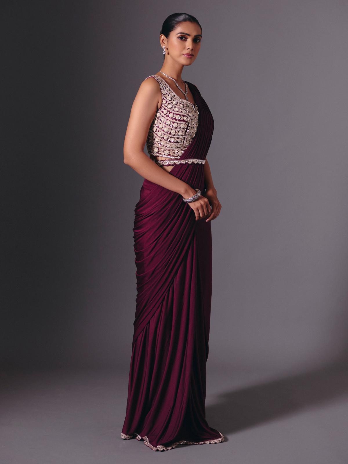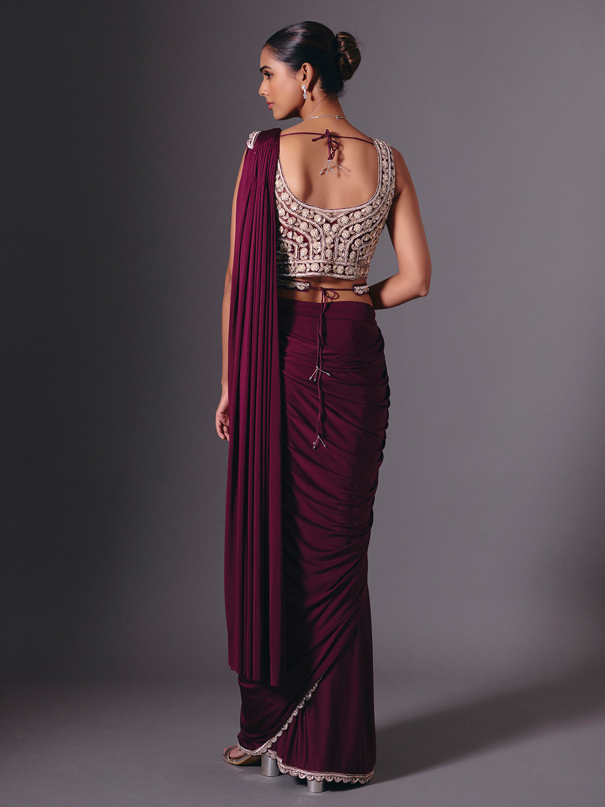 Wine Lycra Saree With Sparkling Festive Embellishments