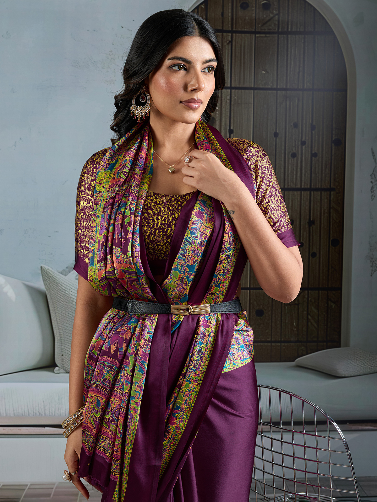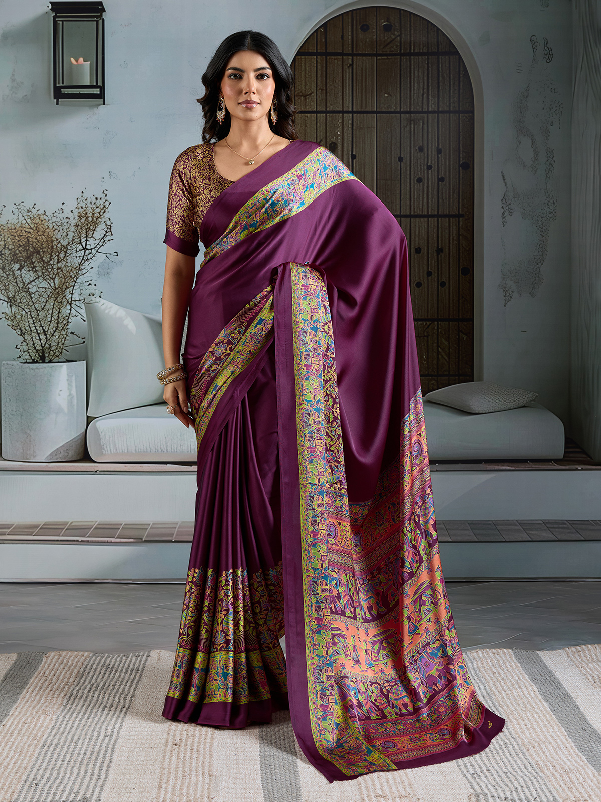 Wine Modal Satin Saree With Elegant Printed Border