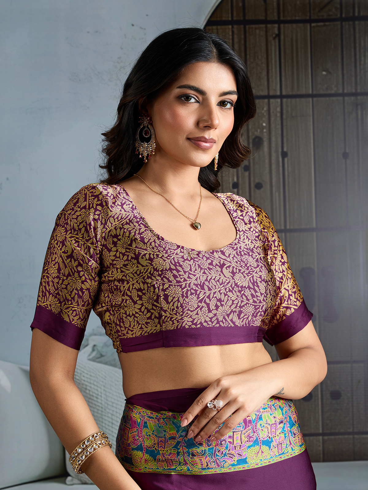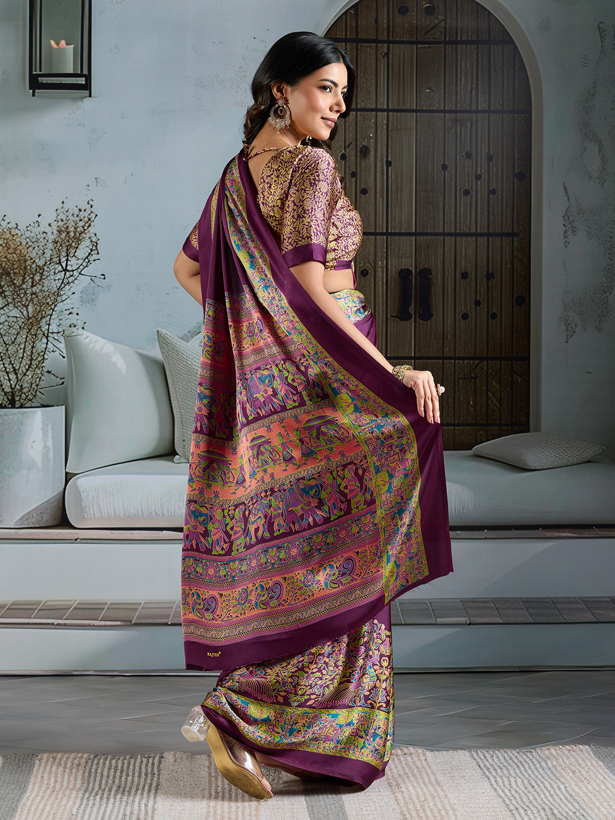 Celebrating natural elegance and confident femininity, this wine Ajrakh printed saree in luxurious modal satin drapes with a rich, graceful sheen. The saree features a beautifully defined Ajrakh printed border with fine detailing that adds cultural depth and rhythmic charm. Ideal for festive gatherings and stylish parties, it is paired with an unstitched printed blouse for a coordinated ethnic look.