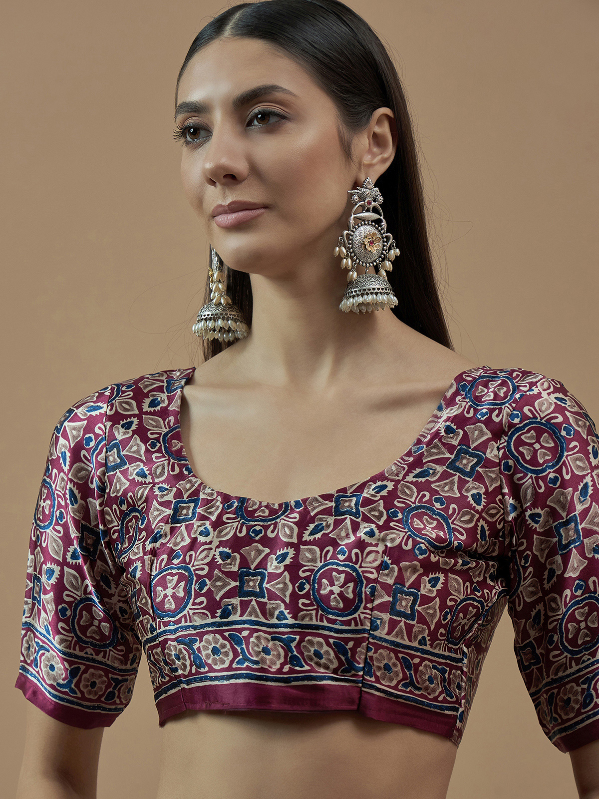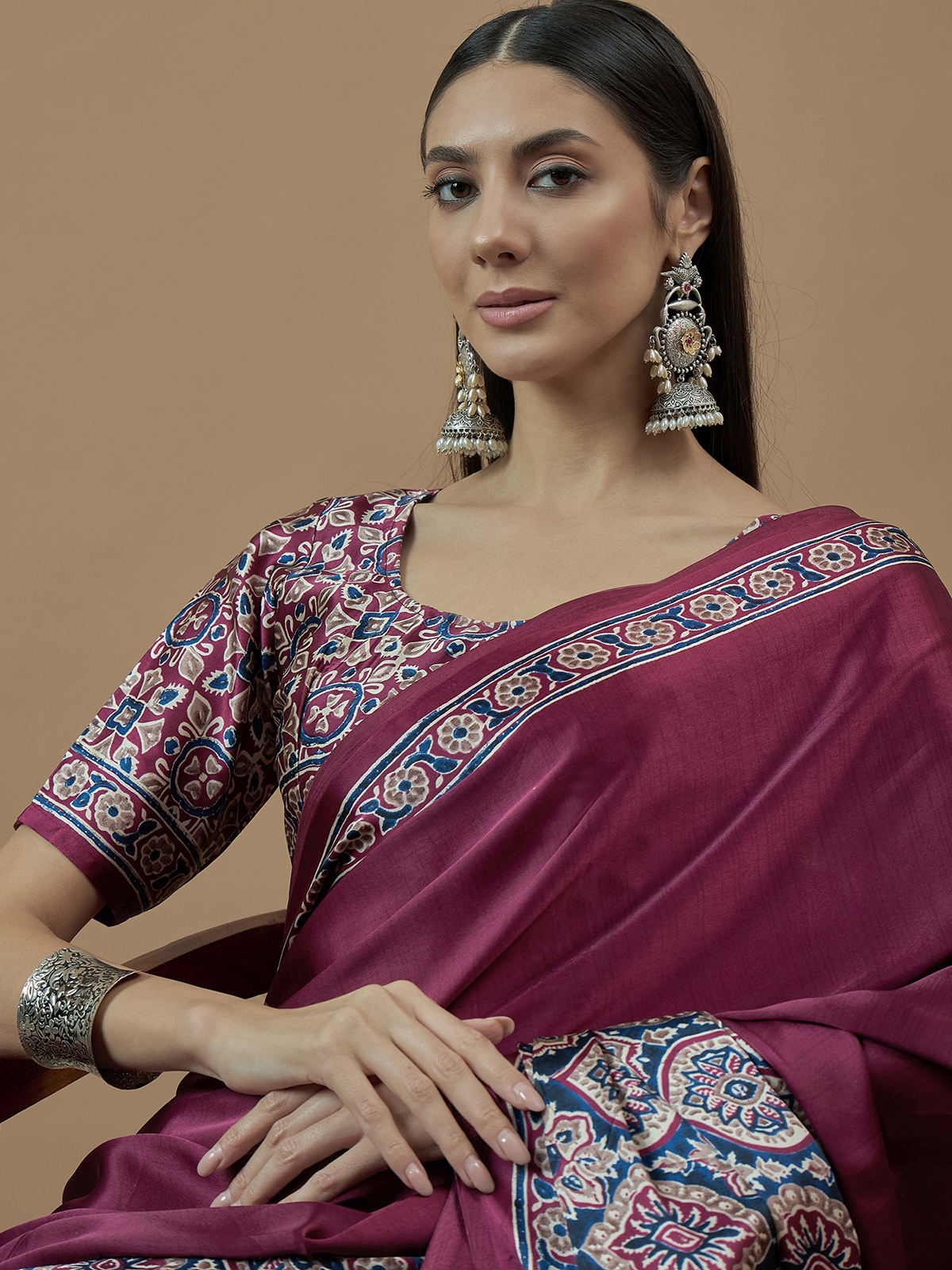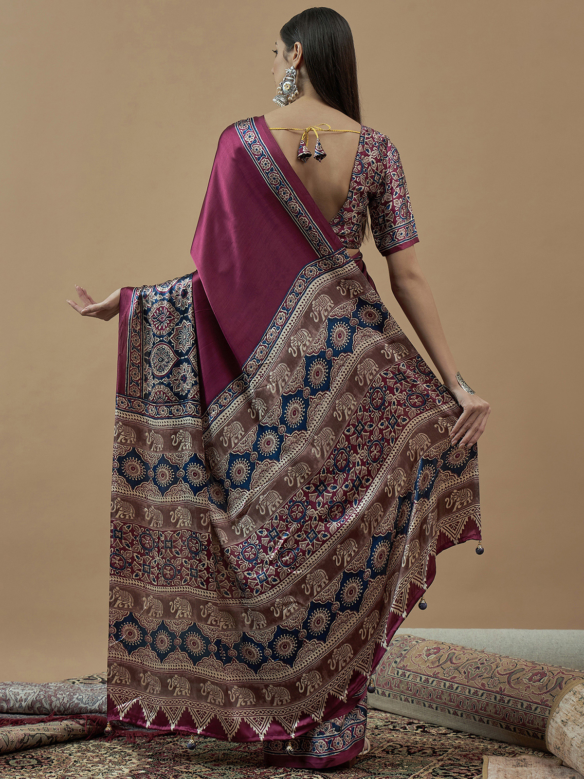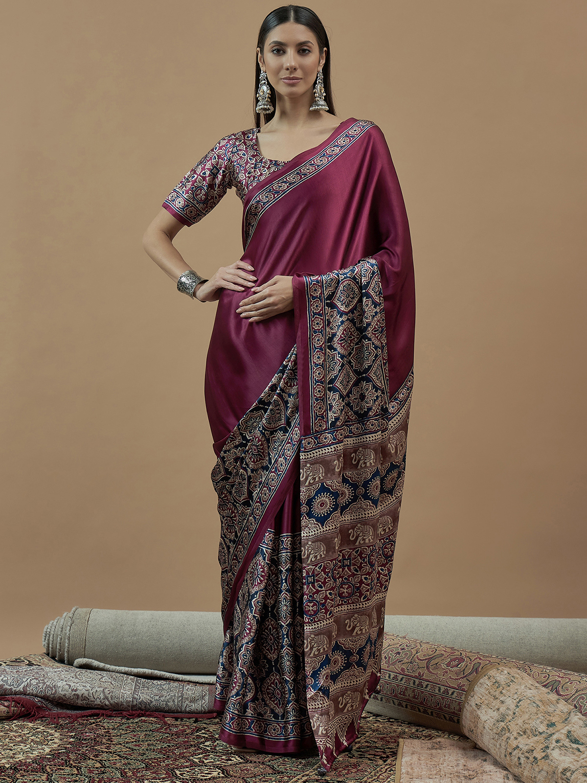 Opt for heritage inspired fashion with this wine japan satin saree. It is bold, traditional print offers a perfect blend of style and culture, ideal for family occasions. Includes an unstitched blouse piece.