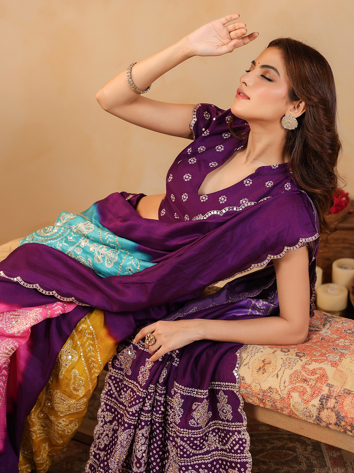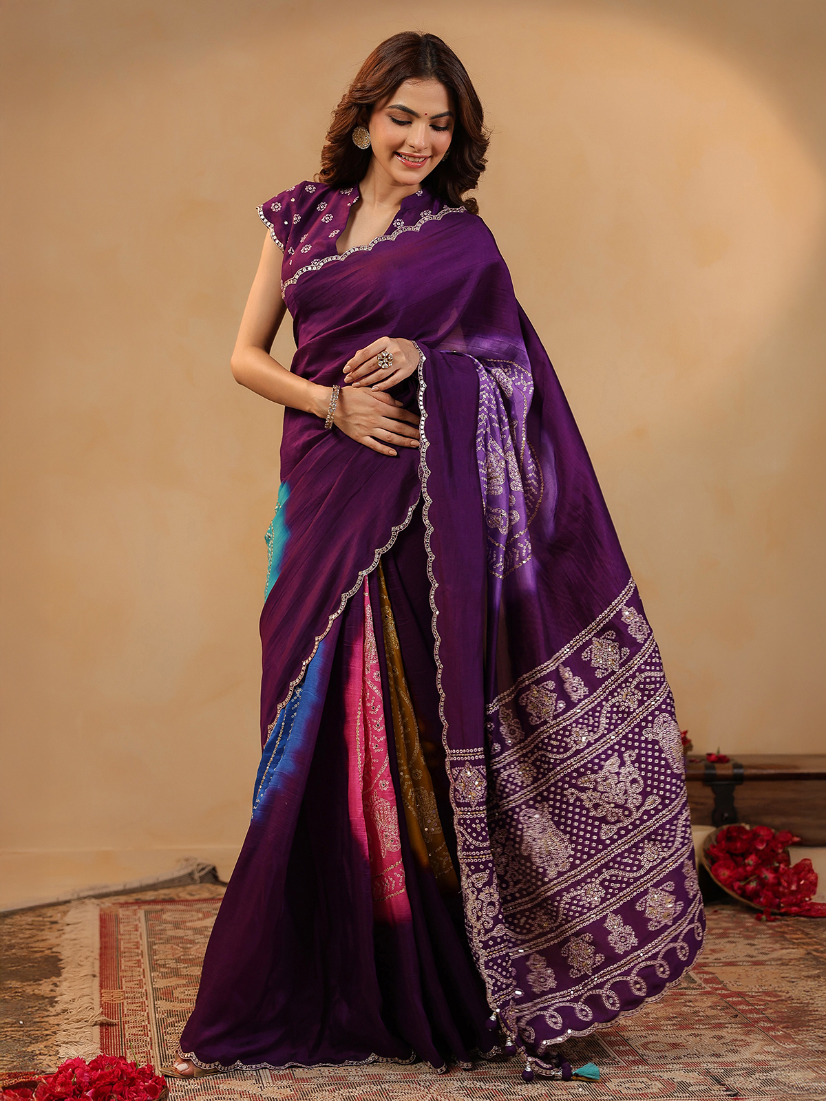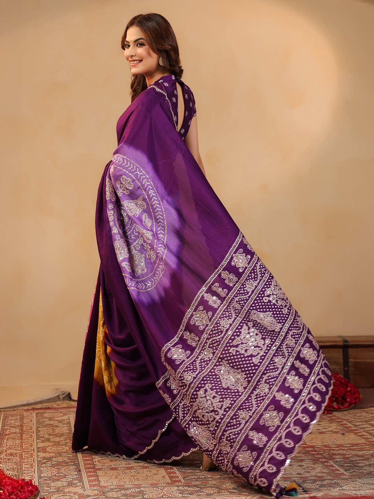 Rich wine tones shimmer across this silk printed saree, soft and regal to the touch. Aabla, resham, and sequins glint like festive sparks. Comes with an unstitched blouse piece, lovely for party and festive celebrations.