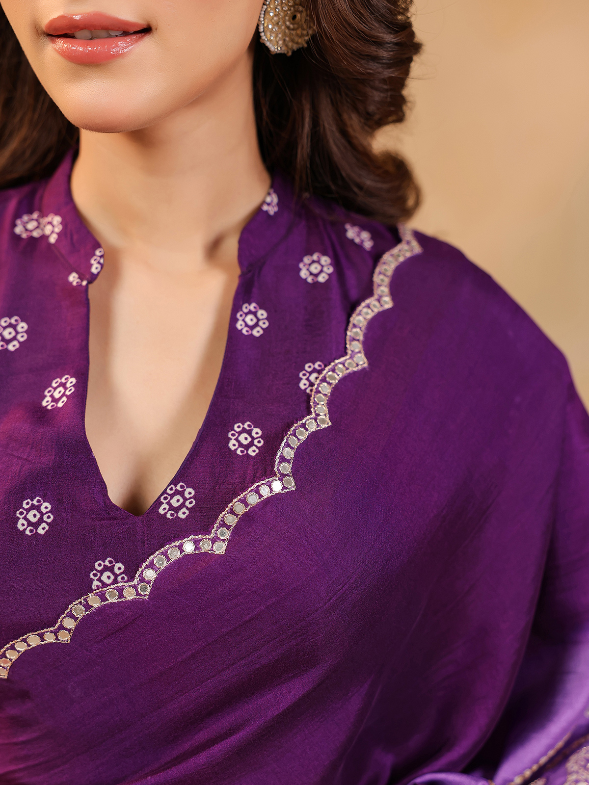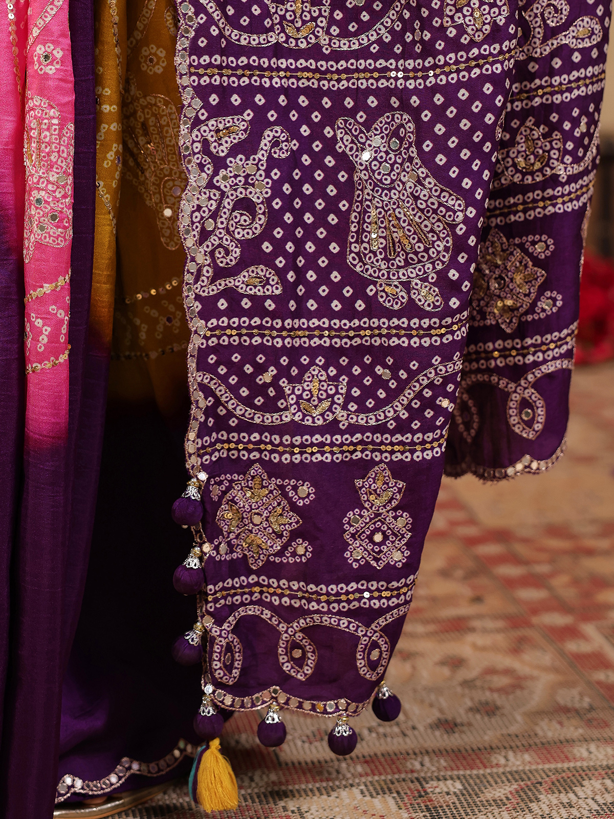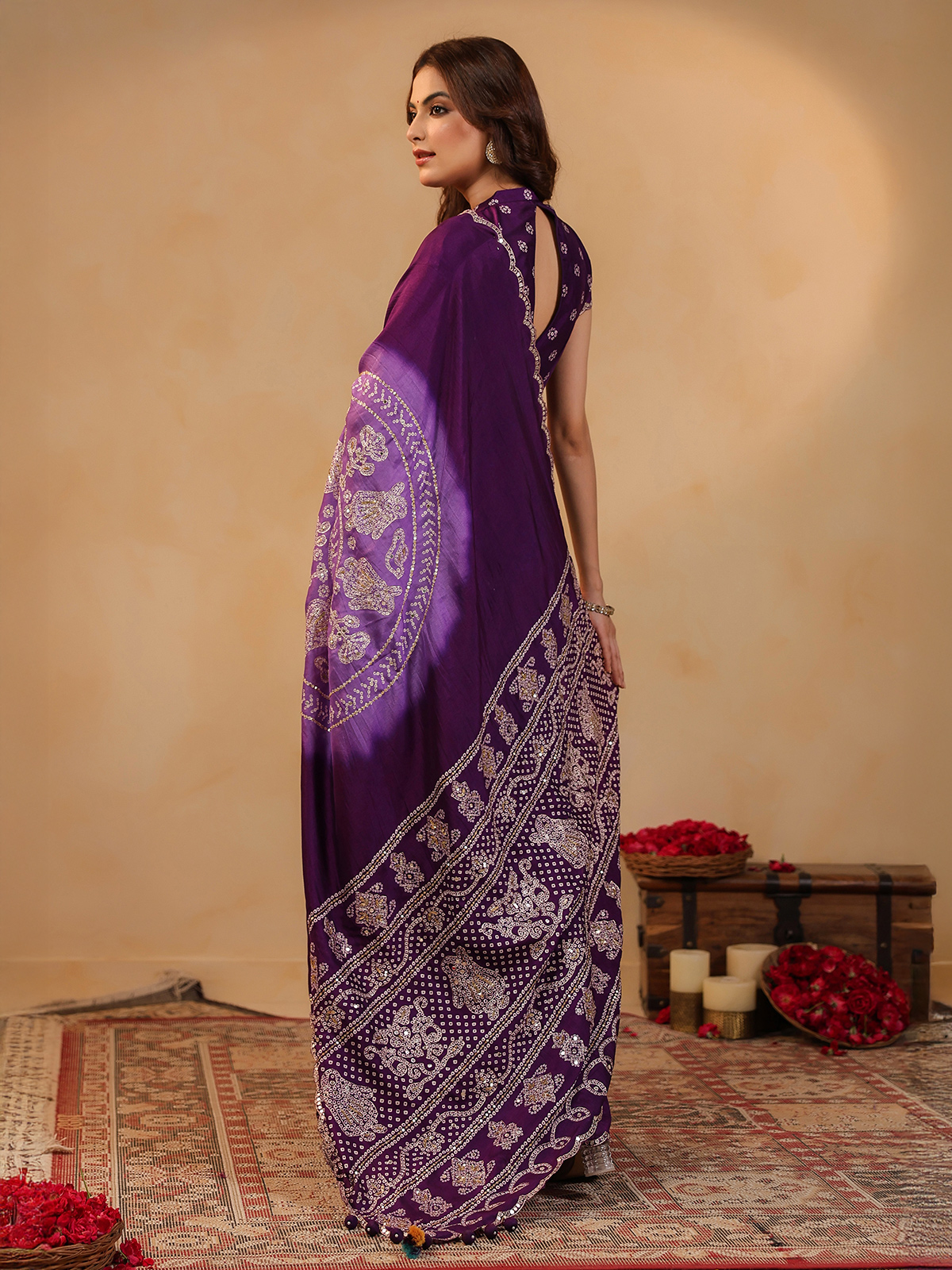 Rich wine tones shimmer across this silk printed saree, soft and regal to the touch. Aabla, resham, and sequins glint like festive sparks. Comes with an unstitched blouse piece, lovely for party and festive celebrations.