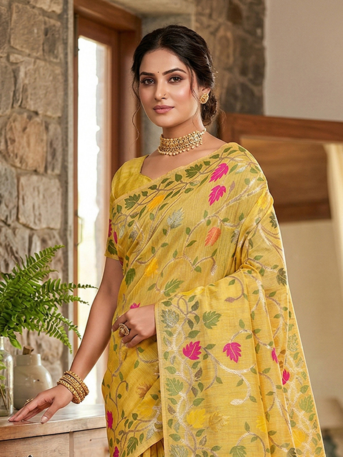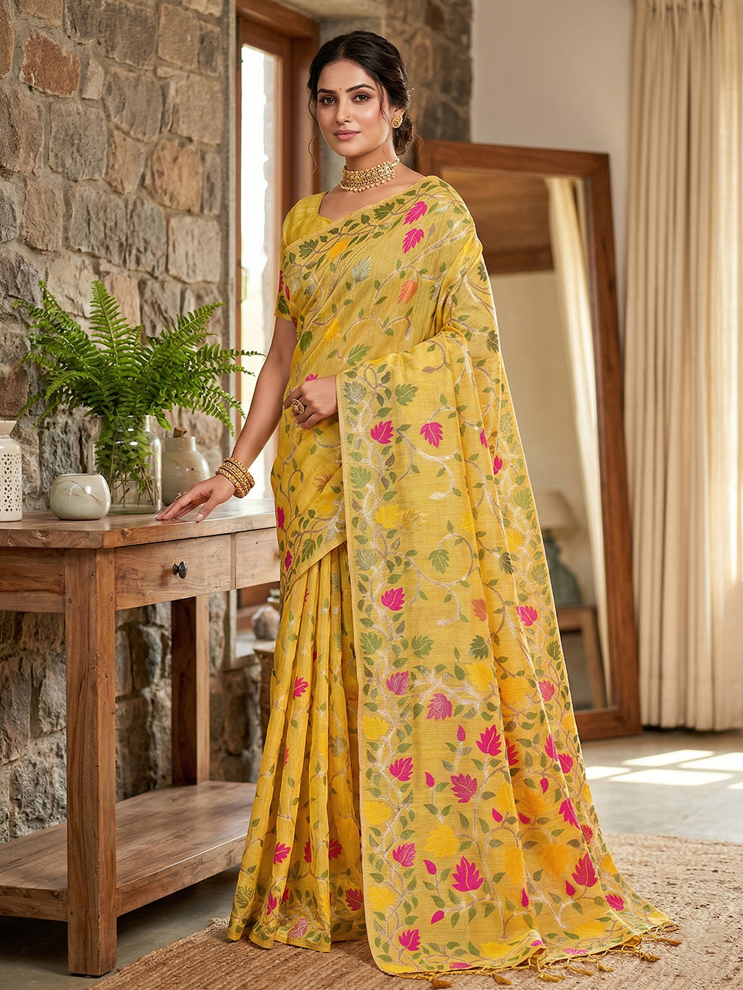 Radiate cheerful elegance with this yellow silk-blend saree adorned with a delicate floral pattern in silver, plum, and mint leaf tones. The coordinated border and tasseled pallu enhance the graceful drape and festive appeal. Paired with an unstitched blouse piece, this ensemble is ideal for brunch events and festive social gatherings.