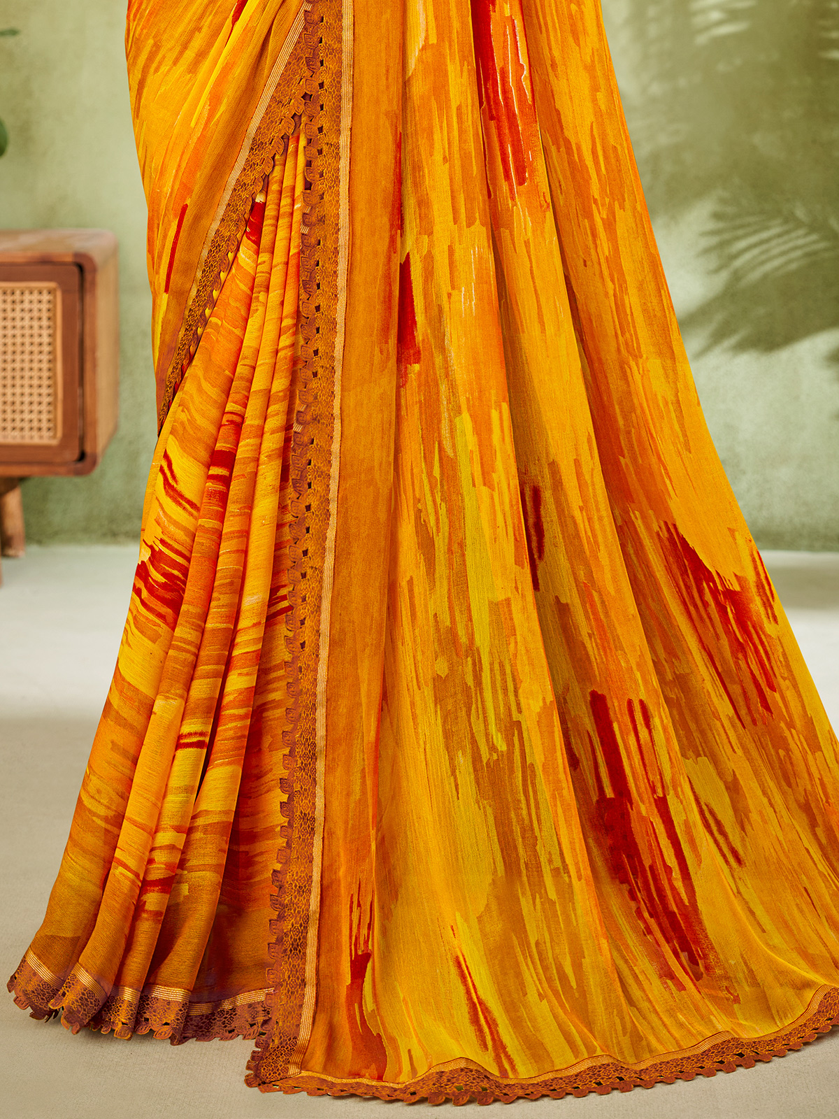 Bright and cheerful, this yellow georgette saree features clean geometric prints finished with a subtle lace border. Lightweight and comfortable, it includes an unstitched blouse, perfect for casual outings, puja functions, and festive celebrations.