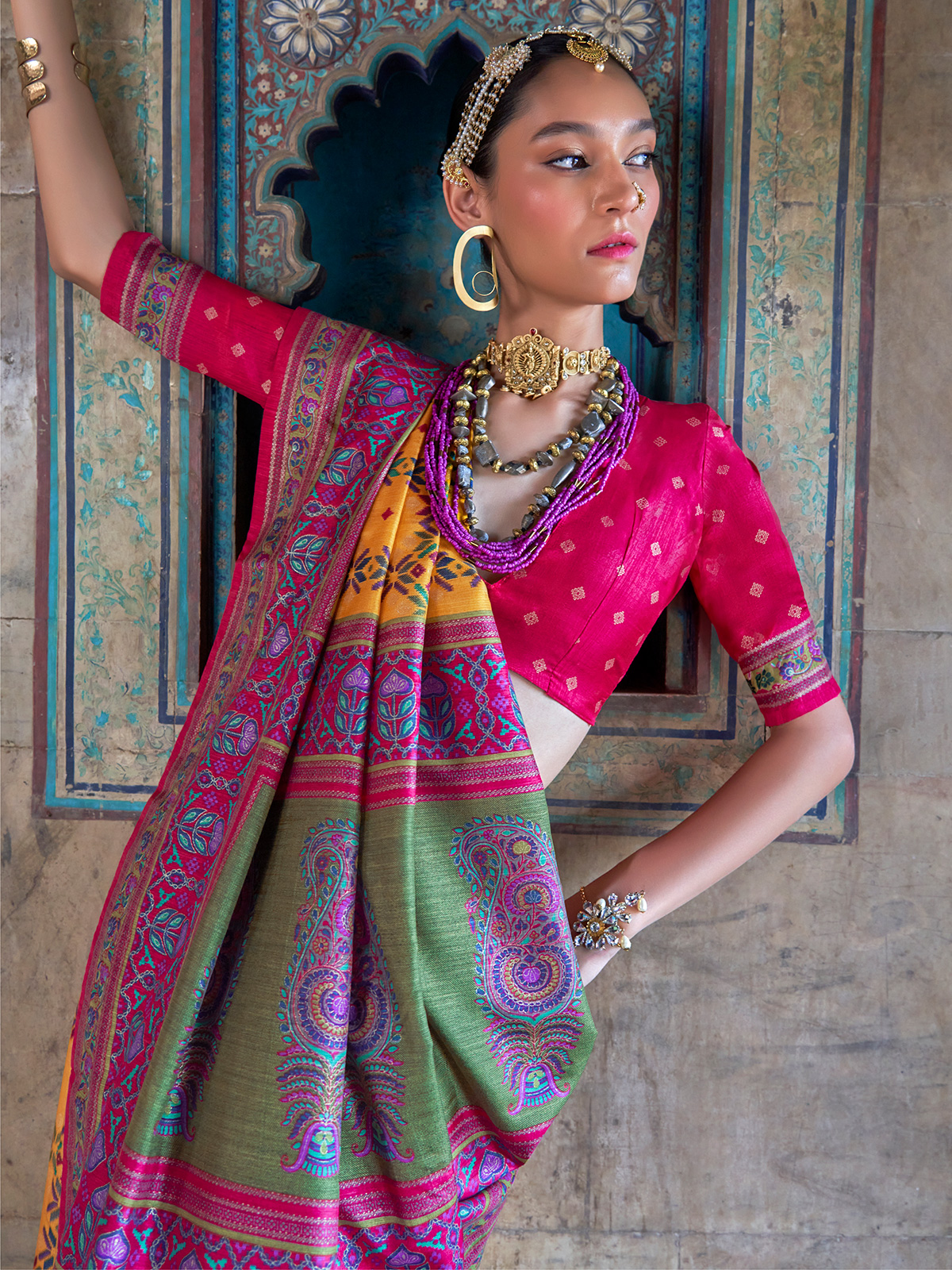 Bright and joyful, this yellow silk saree features a radiant glory finish print ideal for haldi, festive celebrations, weddings, sangeet, and receptions. Its soft drape enhances comfort and charm, while the unstitched blouse allows personalised styling for a vibrant and memorable look.