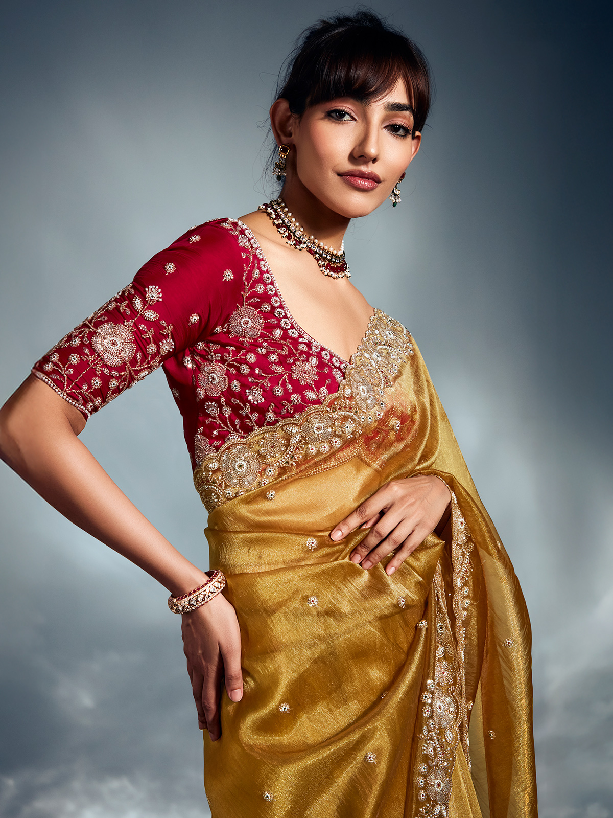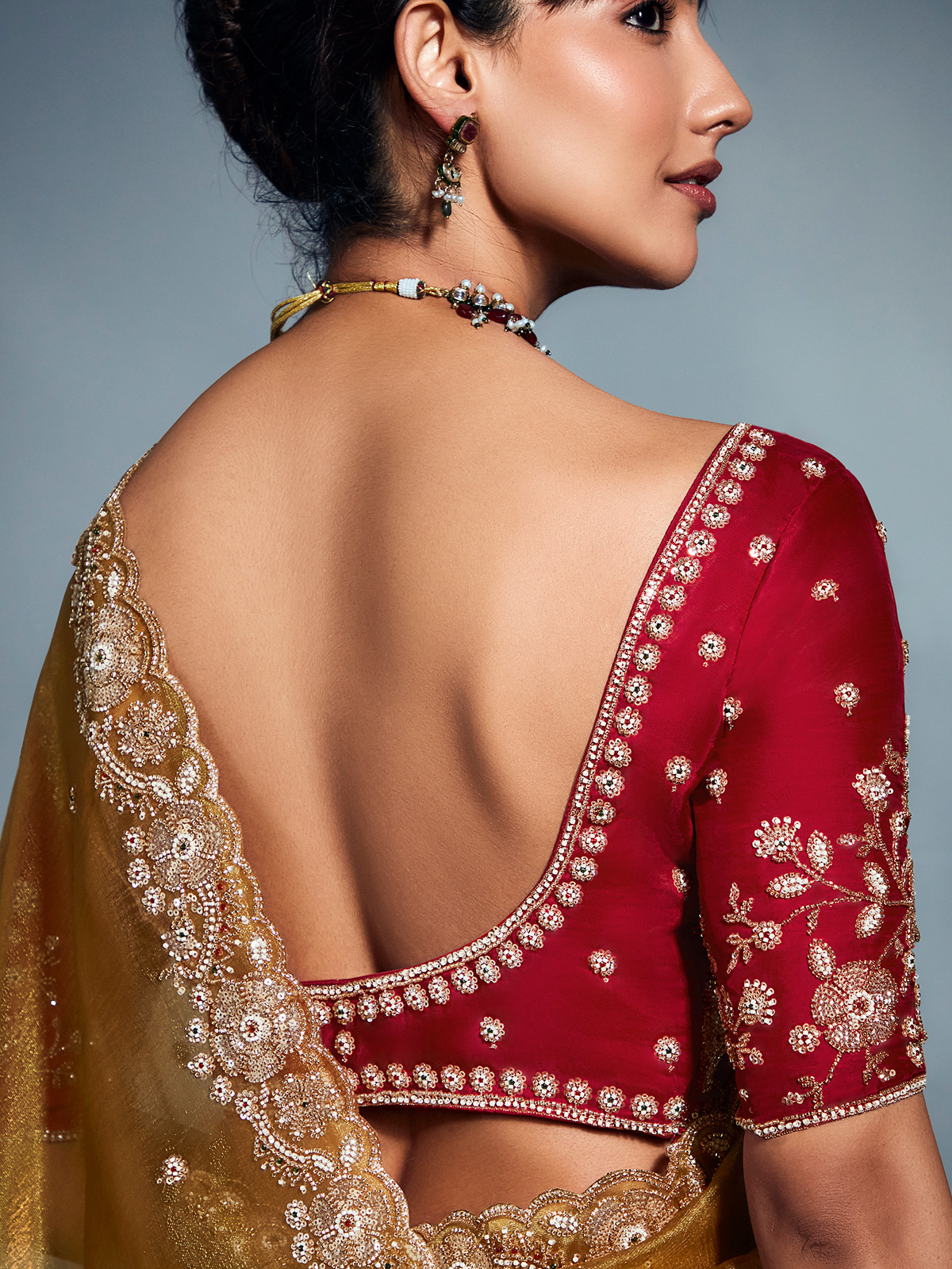 Bright and delightful, this yellow tissue organza saree showcases intricate sequins, bead and cutdana work that adds cheerful shine. Perfect for daytime functions like haldi, as well as parties, receptions and weddings. A comfortable drape with an unstitched blouse piece included.