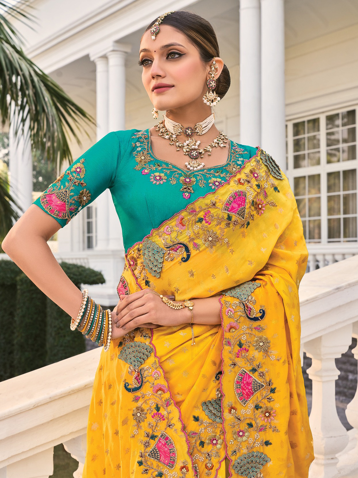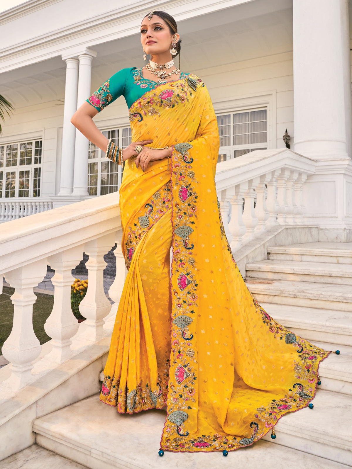 Add a radiant charm to your ethnic wardrobe with this yellow printed silk saree. Embellished with moti, cutdana, zardosi, thread and sequins work, it is perfect for festive or wedding occasions and comes with an unstitched blouse.