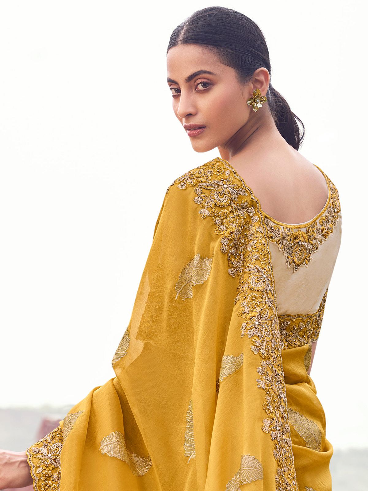 This yellow tissue silk saree shines with lavish zardosi, beads, sequins, zari, embroidery, stones and mirror work. Paired with an unstitched blouse, it becomes a beautiful pick for weddings, receptions, sangeet functions, festive occasions and haldi ceremonies, adding a luminous charm to every moment.