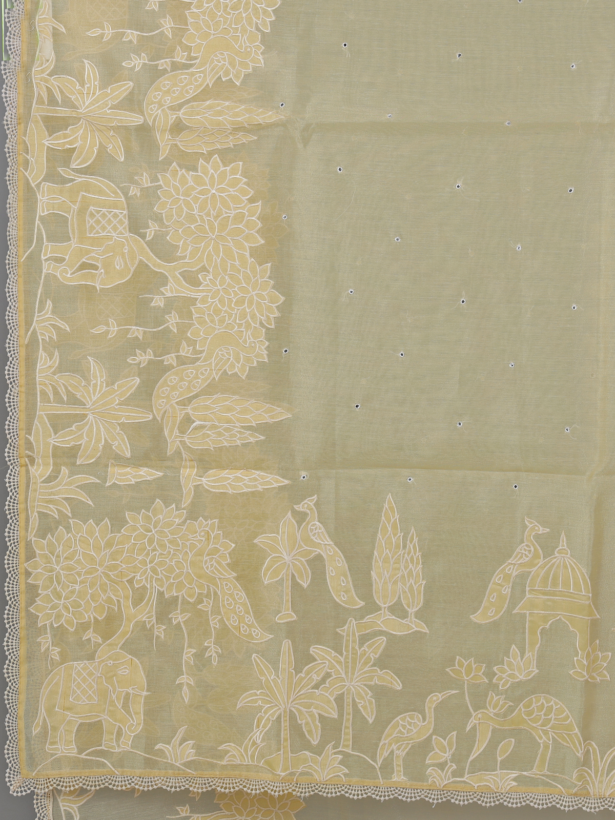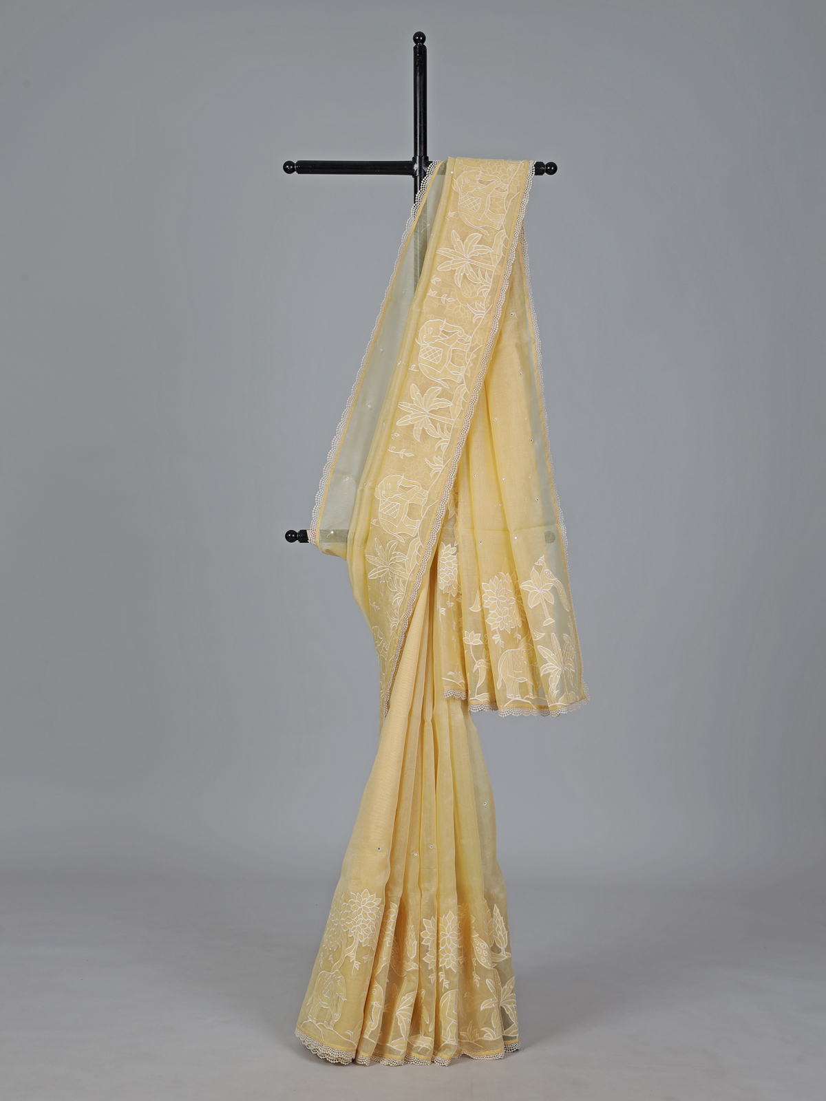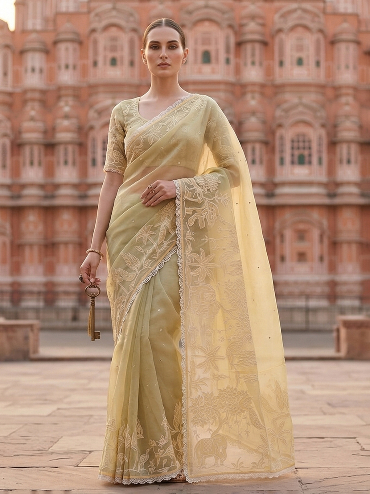 Bright and joyful yellow semi organza saree is adorned with embroidery and mirror work. Creating a lively festive glow. Perfect for haldi ceremonies and celebrations, it radiates cheerful elegance. Comes with an unstitched blouse piece.