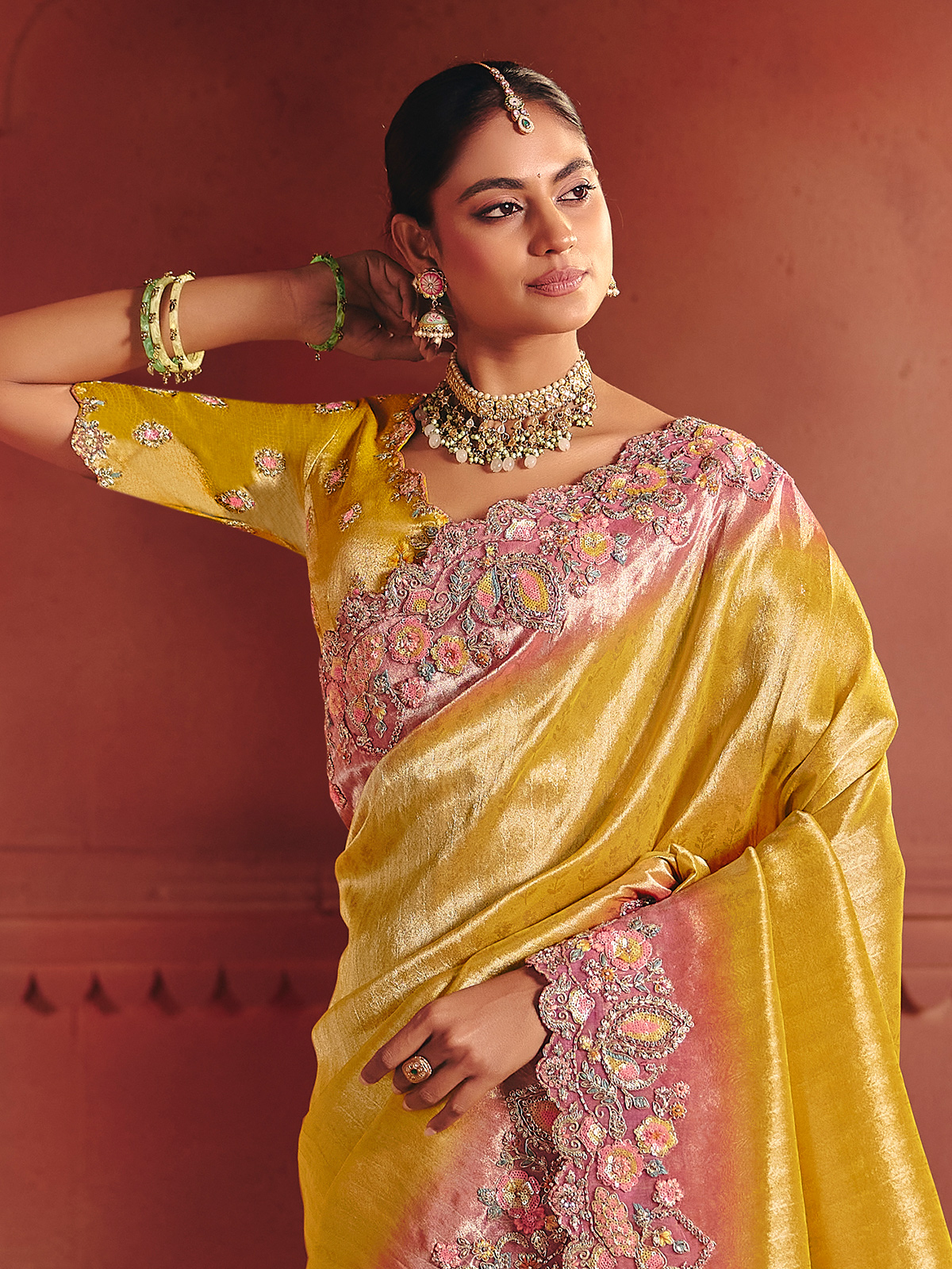 Unstitched silk blouse featuring graceful zari and zardosi craftsmanship along borders. Bright yellow shade brings festive charm and positivity. Perfect choice for wedding, bridal, reception, sangeet, haldi ceremonies. Comfortable fabric supports easy stitching and long-lasting wear for special occasions.
