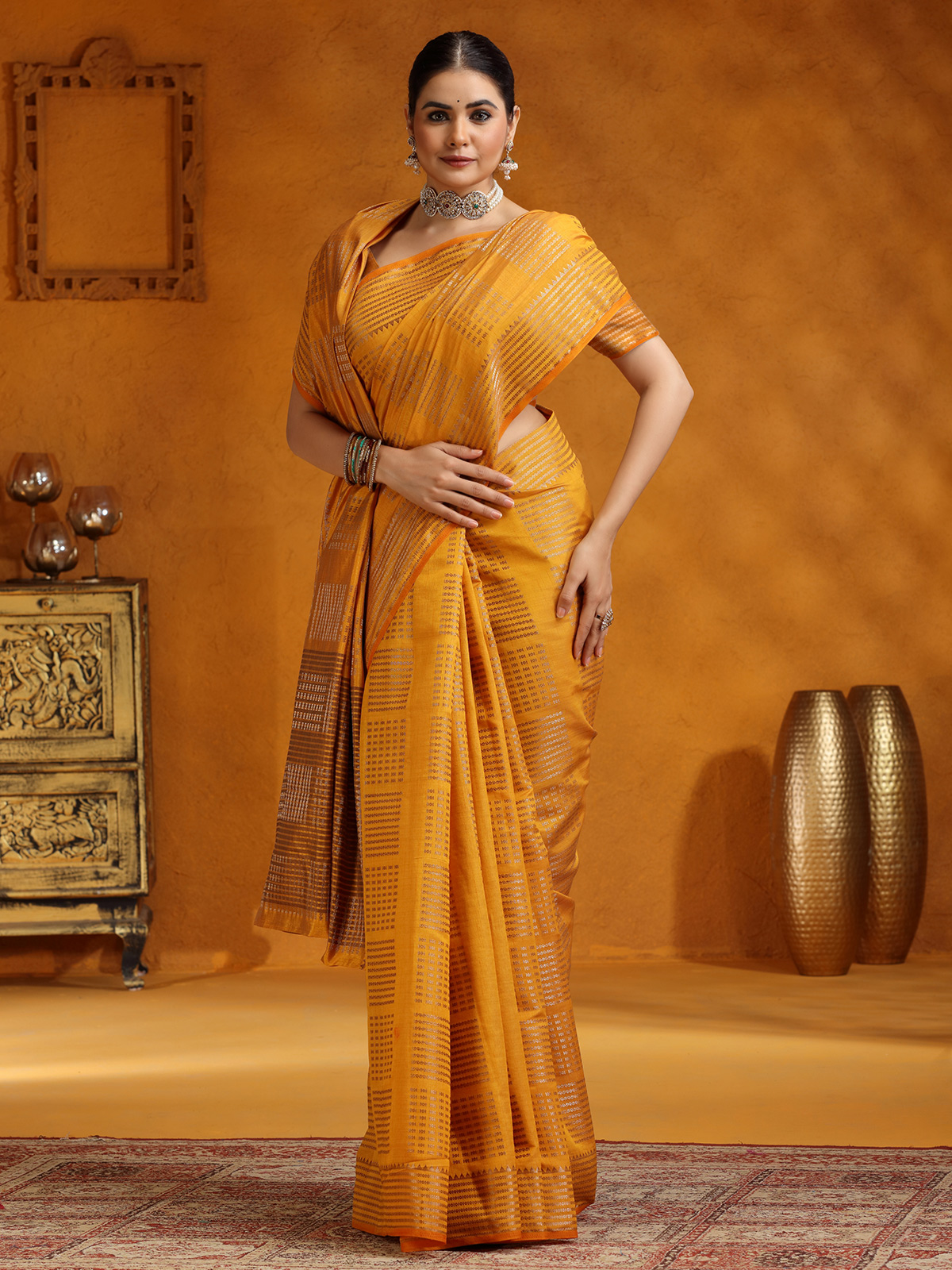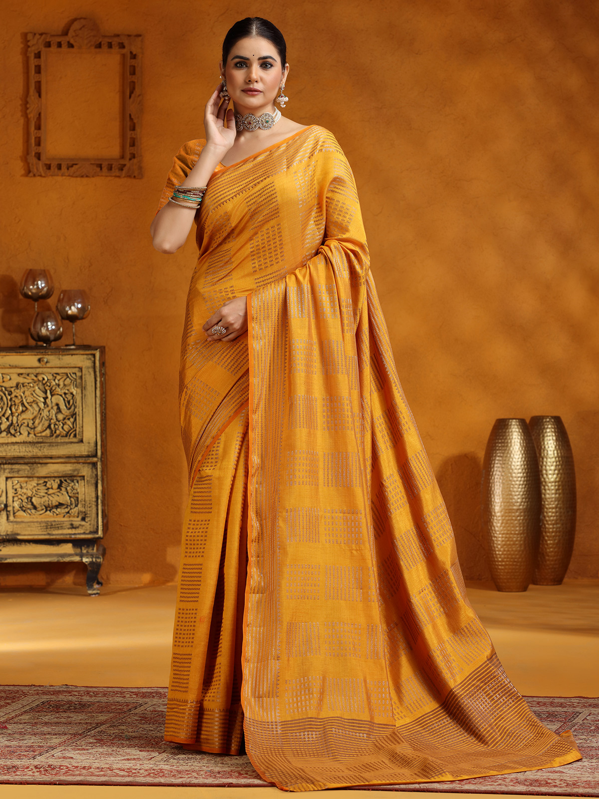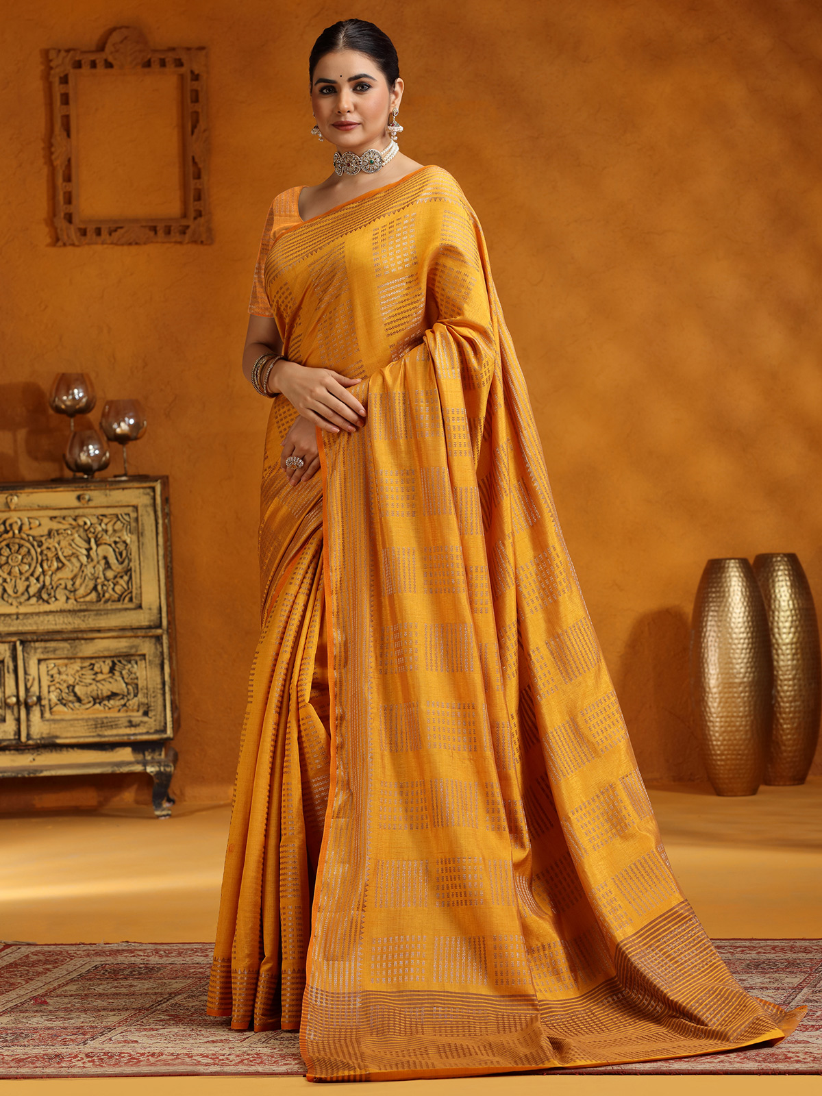 A graceful expression of tradition, this yellow silk saree features intricate zari weaving and includes an unstitched blouse.