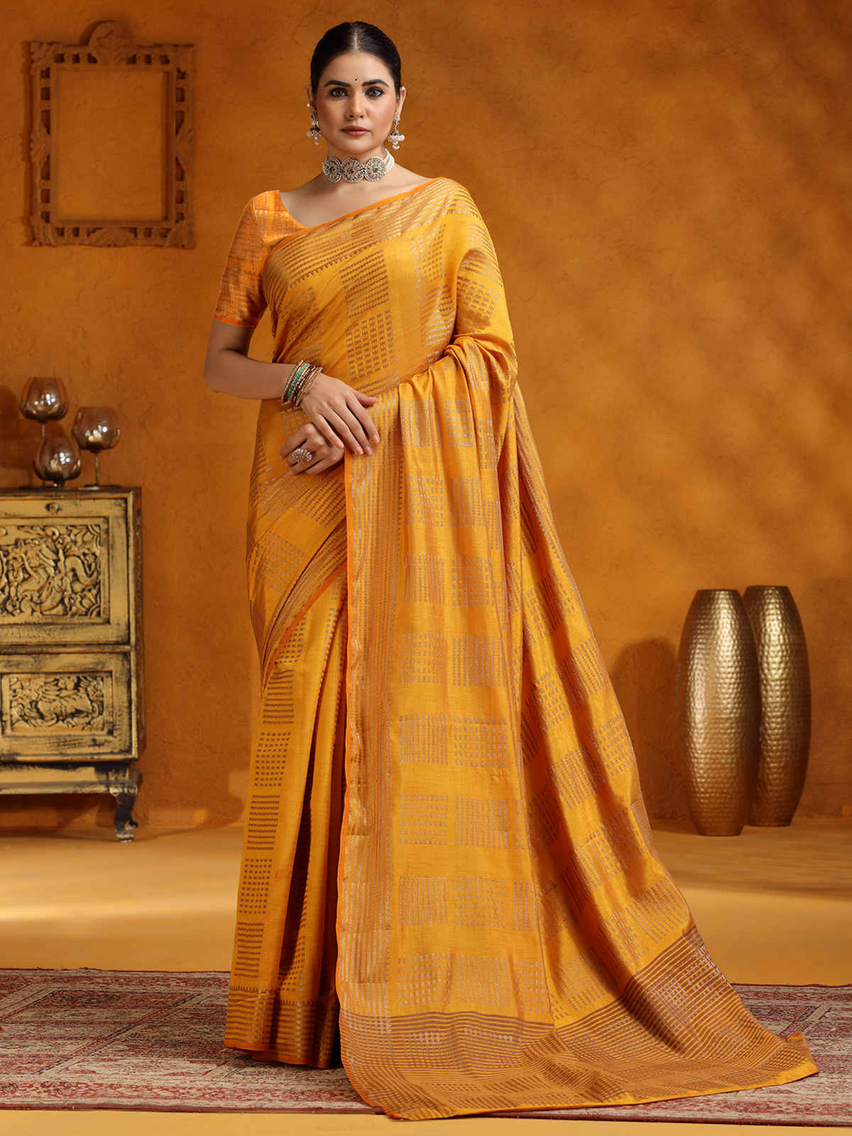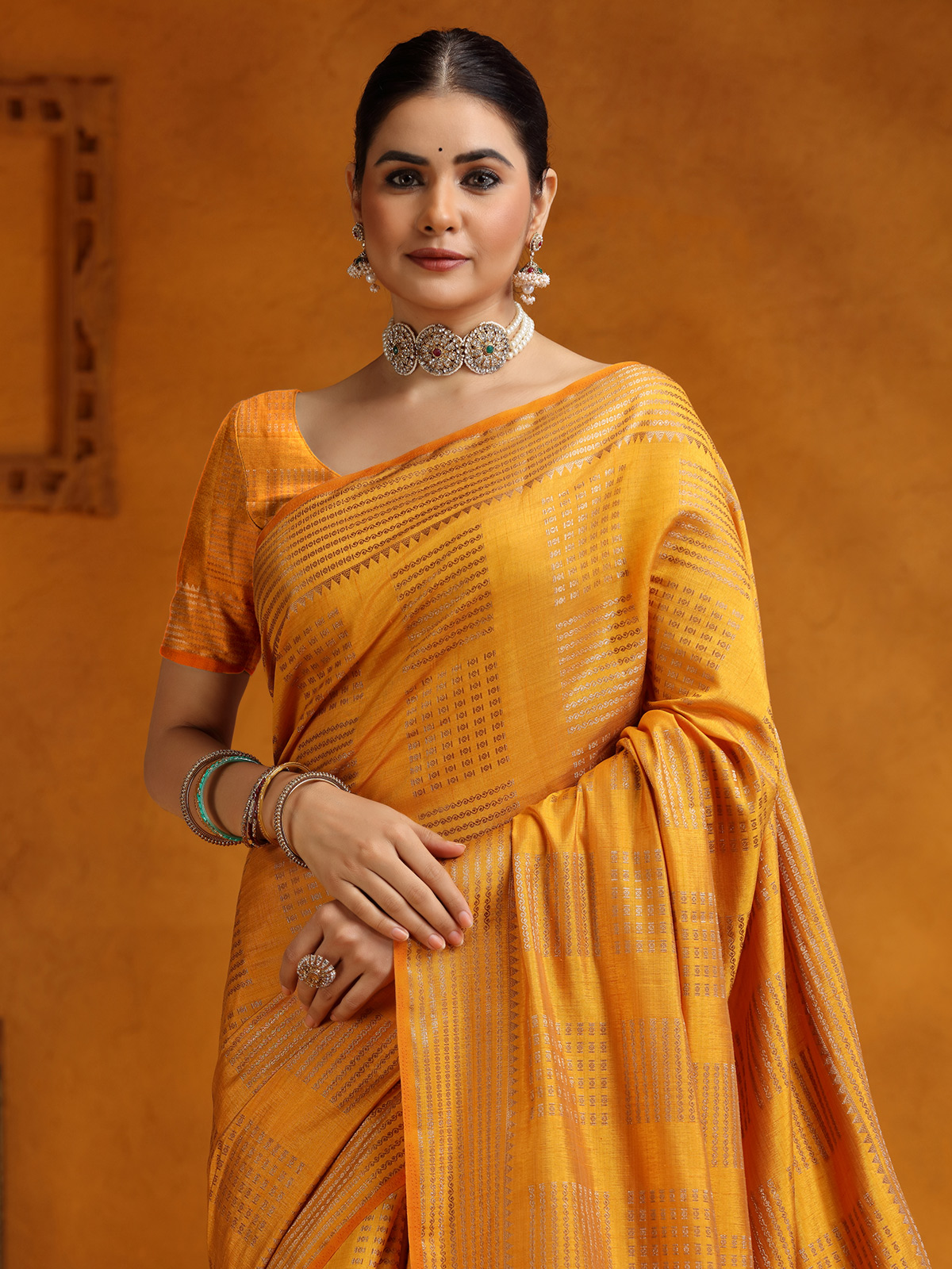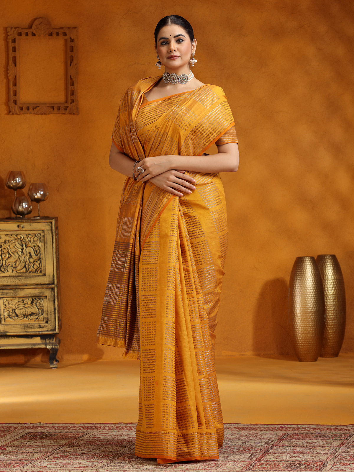 A graceful expression of tradition, this yellow silk saree features intricate zari weaving and includes an unstitched blouse.