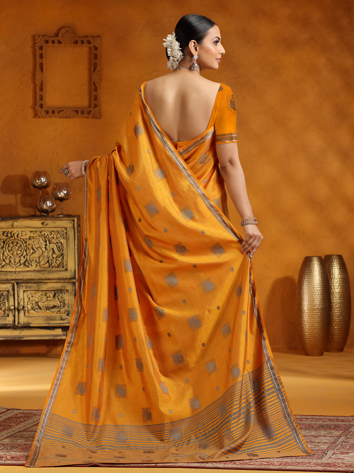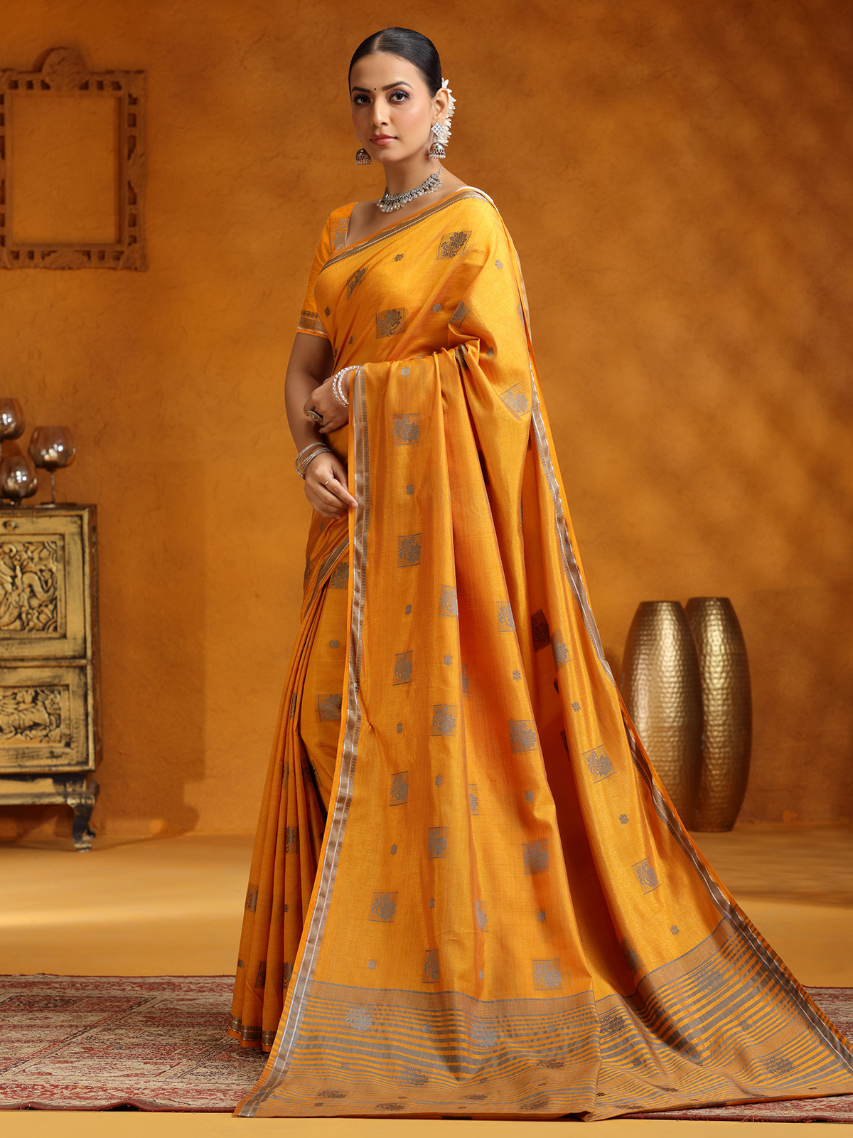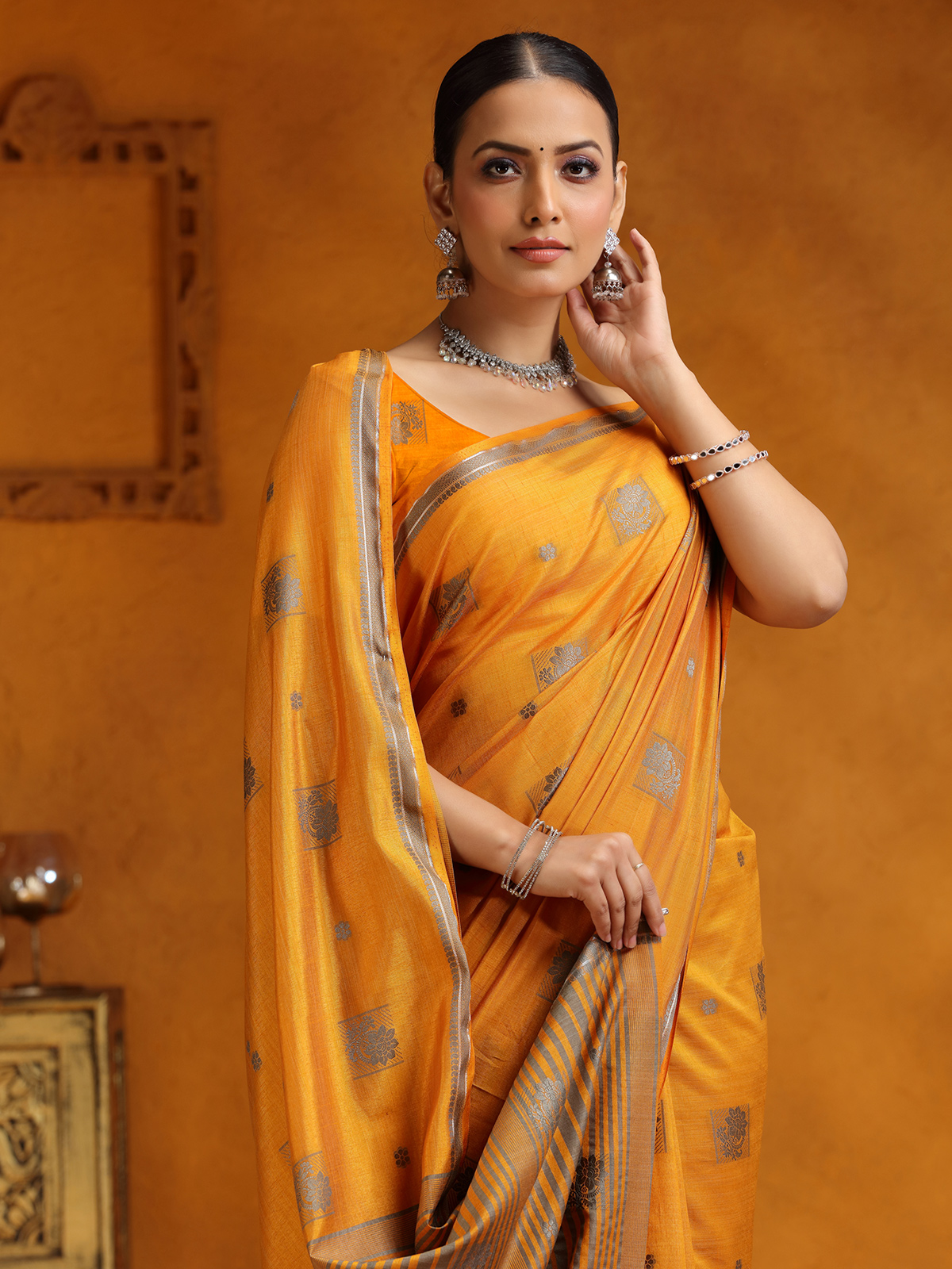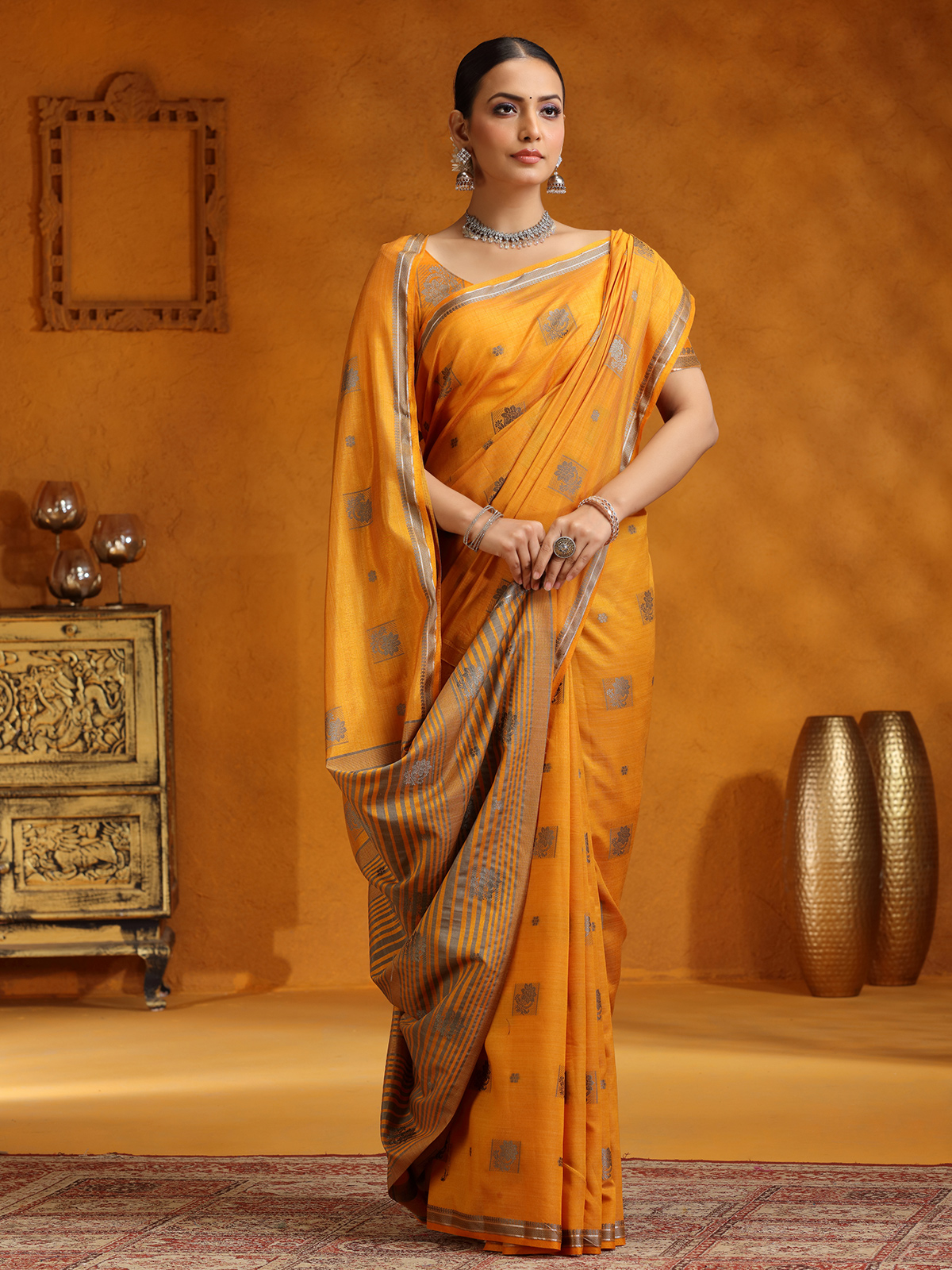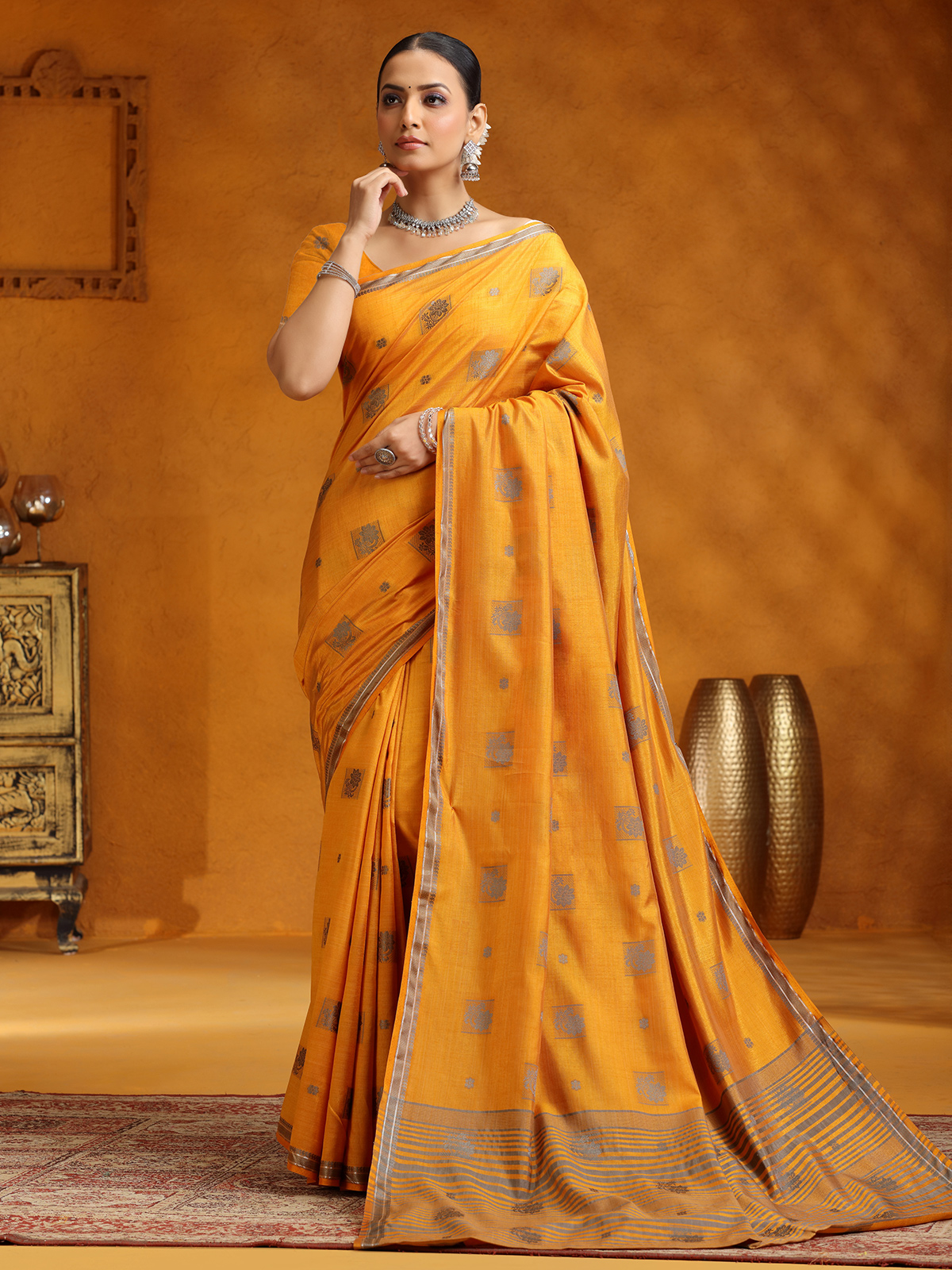 Deep hues and stunning zari work make this yellow silk saree a must-have for cultural events. Paired with an unstitched blouse.
