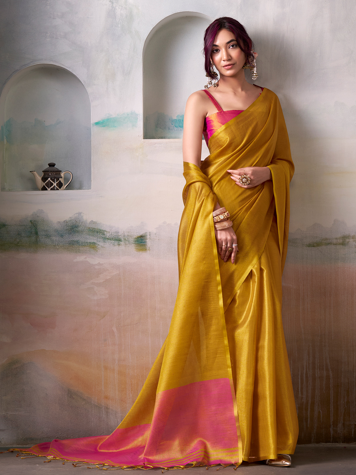 Bright and captivating, this yellow tissue silk saree radiates festive warmth and charm. Its sheen and fluid fall make it ideal for reception and celebration wear. With an unstitched blouse piece, it allows for customized styling, ensuring a balance of traditional grace and contemporary appeal.