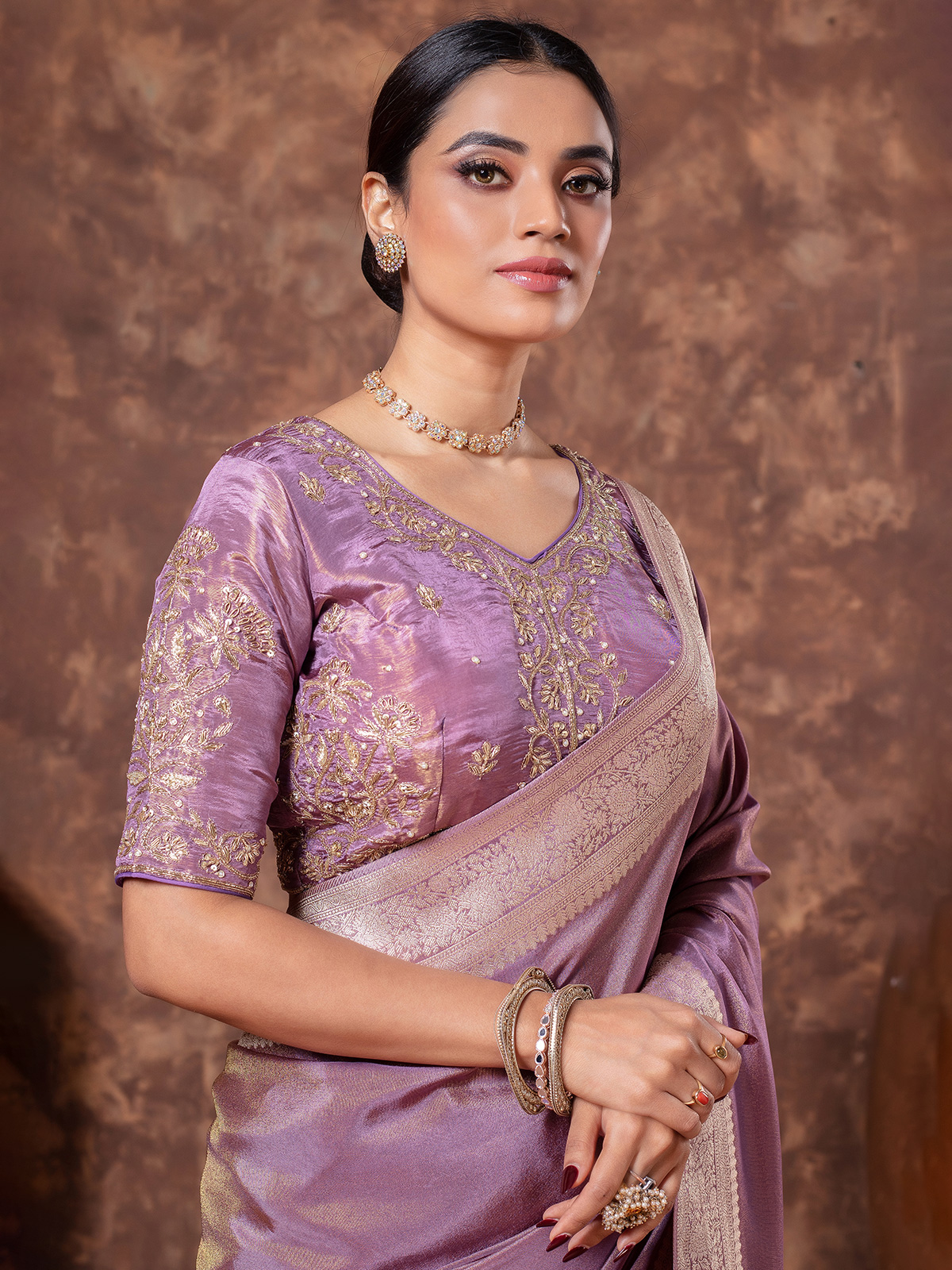 Indulge in graceful glamour with our light purple tissue silk saree, highlighted by captivating zari weaving. Paired with a ready-made blouse featuring intricate handwork.